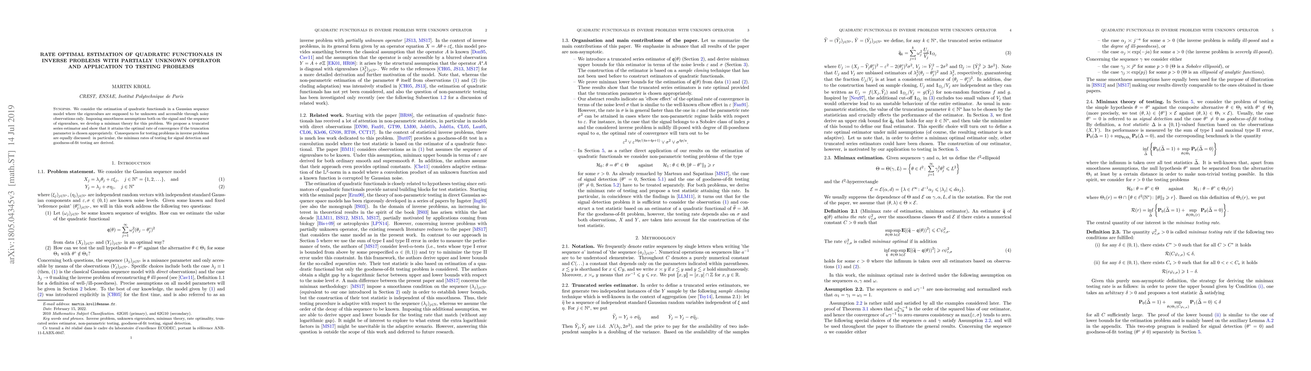 This paper develops a minimax theory for estimating quadratic functionals in a Gaussian sequence model with unknown eigenvalues, proposing a truncated series estimator that achieves optimal convergence rates. The study also extends the findings to testing problems in inverse problems, deriving minimax rates for signal detection and goodness-of-fit testing.