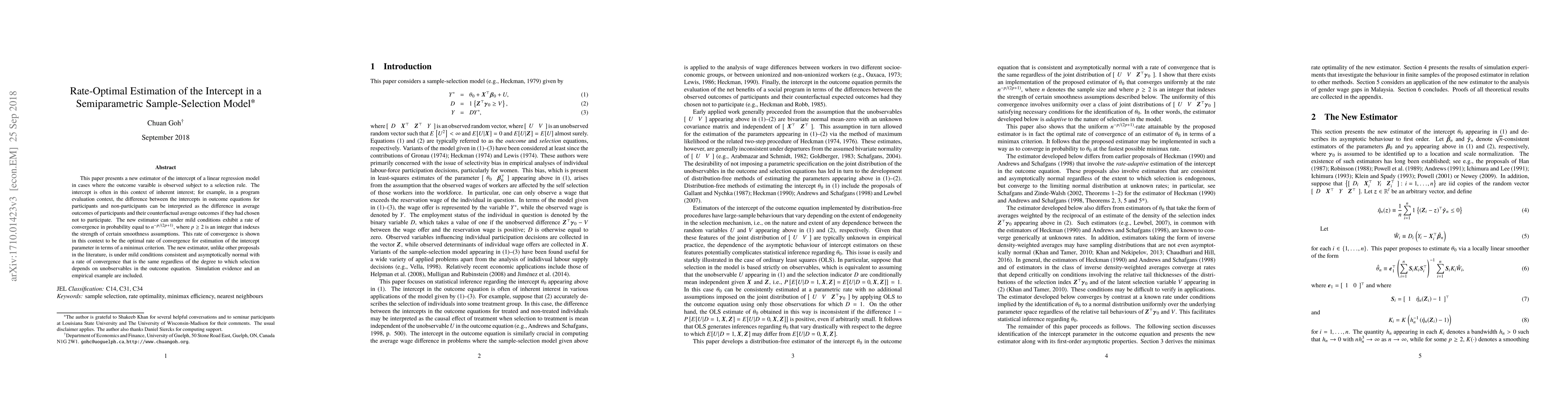 This paper introduces a new estimator for the intercept in a semiparametric sample-selection model, achieving optimal convergence rate $n^{-p/(2p+1)}$ for $p \geq 2$. Unlike previous methods, it is consistent, asymptotically normal, and maintains this rate regardless of selection dependence on unobservables.