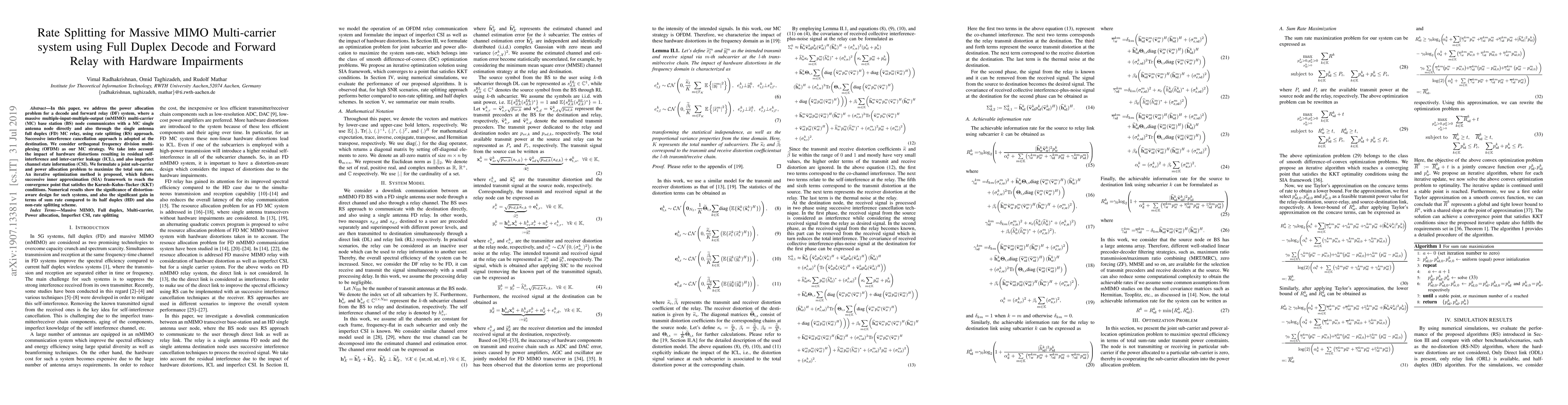 This paper proposes a power allocation method for a massive MIMO multi-carrier DF relay system using full duplex relay, focusing on rate splitting and successive interference cancellation. It considers hardware impairments and formulates an iterative optimization to maximize sum rate, demonstrating significant gains over half duplex and non-rate splitting schemes.