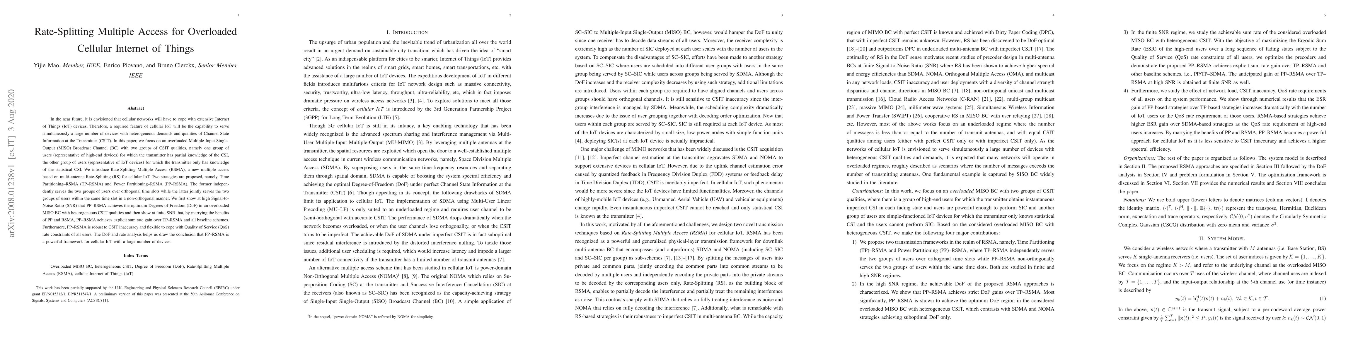 This paper introduces Rate-Splitting Multiple Access (RSMA) for managing overloaded cellular networks with diverse Internet of Things (IoT) devices. It proposes two strategies, TP-RSMA and PP-RSMA, showing that PP-RSMA achieves optimal Degrees-of-Freedom and superior sum rate gains, while being robust to CSIT inaccuracies and flexible for QoS constraints.