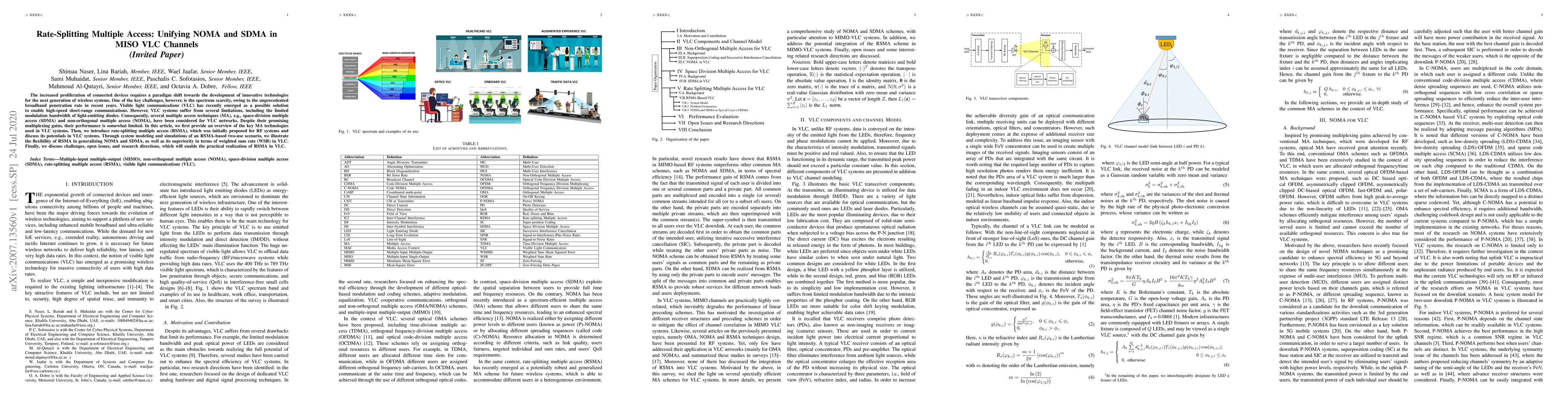 This paper explores rate-splitting multiple access (RSMA) as a unifying approach for non-orthogonal multiple access (NOMA) and space-division multiple access (SDMA) in MISO visible light communication (VLC) systems, demonstrating its potential to outperform both NOMA and SDMA in terms of weighted sum rate. The study also highlights challenges and future research directions for practical implementation of RSMA in VLC.