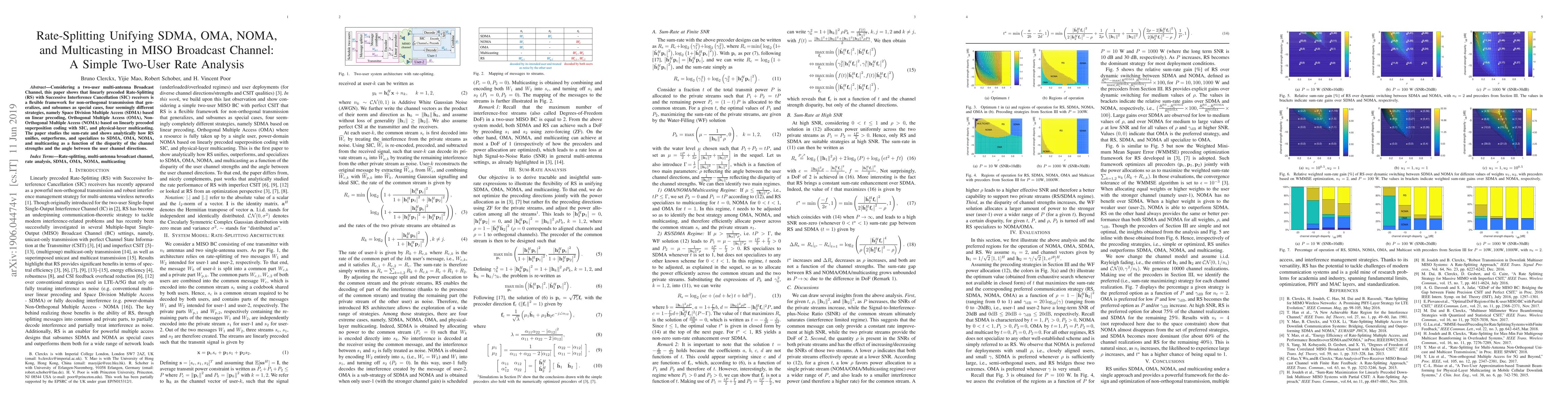 Considering a two-user multi-antenna Broadcast Channel, this paper shows that linearly precoded Rate-Splitting (RS) with Successive Interference Cancellation (SIC) receivers is a flexible framework for non-orthogonal transmission that generalizes, and subsumes as special cases, four seemingly different strategies, namely Space Division Multiple Access (SDMA) based on linear precoding, Orthogonal Multiple Access (OMA), Non- Orthogonal Multiple Access (NOMA) based on linearly precoded superposition coding with SIC, and physical-layer multicasting. The paper studies the sum-rate and shows analytically how RS unifies, outperforms, and specializes to SDMA, OMA, NOMA, and multicasting as a function of the disparity of the channel strengths and the angle between the user channel directions.