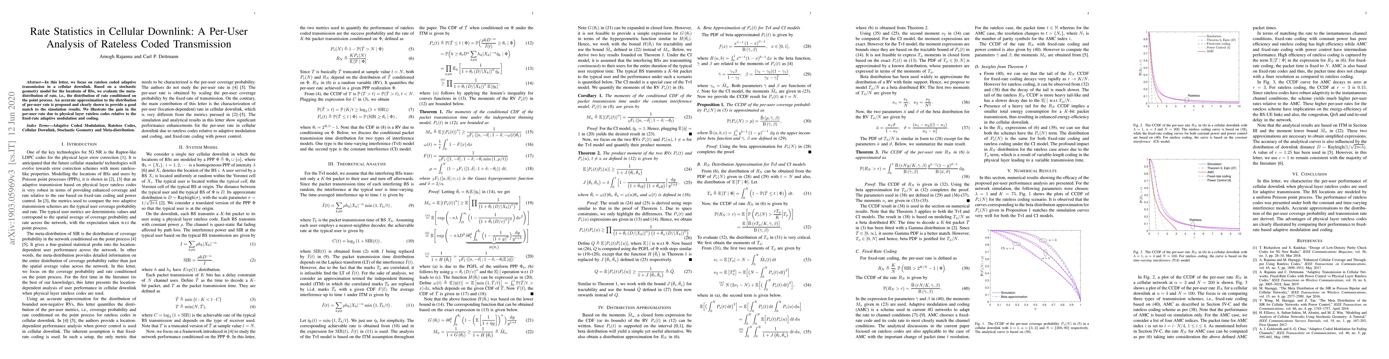 This paper examines rateless coded adaptive transmission in cellular downlink networks, proposing an accurate approximation for the distribution of per-user rate based on a stochastic geometry model. The study shows significant gains in per-user rate using rateless codes compared to fixed-rate adaptive modulation and coding.