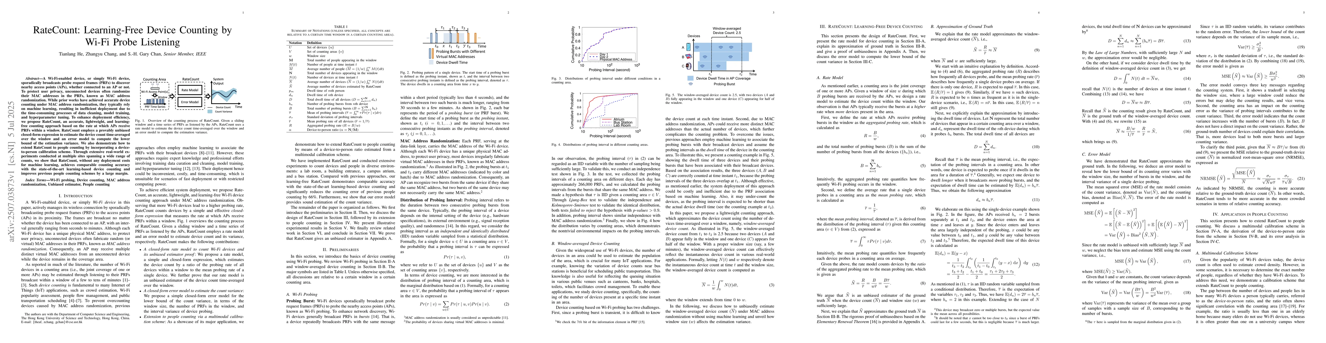 A Wi-Fi-enabled device, or simply Wi-Fi device, sporadically broadcasts probe request frames (PRFs) to discover nearby access points (APs), whether connected to an AP or not. To protect user privacy, unconnected devices often randomize their MAC addresses in the PRFs, known as MAC address randomization. While prior works have achieved accurate device counting under MAC address randomization, they typically rely on machine learning, resulting in inefficient deployment due to the time-consuming processes of data cleaning, model training, and hyperparameter tuning. To enhance deployment efficiency, we propose RateCount, an accurate, lightweight, and learning-free counting approach based on the rate at which APs receive PRFs within a window. RateCount employs a provably unbiased closed-form expression to estimate the device count time-averaged over the window and an error model to compute the lower bound of the estimation variance. We also demonstrate how to extend RateCount to people counting by incorporating a device-to-person calibration scheme. Through extensive real-world experiments conducted at multiple sites spanning a wide range of counts, we show that RateCount, without any deployment costs for machine learning, achieves comparable counting accuracy with the state-of-the-art learning-based device counting and improves previous people counting schemes by a large margin.