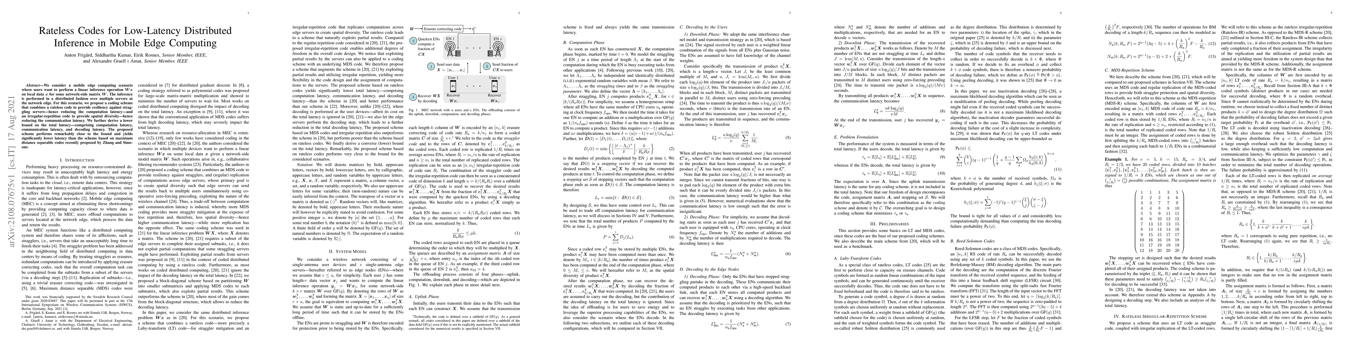 We consider a mobile edge computing scenario where users want to perform a linear inference operation $\boldsymbol{W} \boldsymbol{x}$ on local data $\boldsymbol{x}$ for some network-side matrix $\boldsymbol{W}$. The inference is performed in a distributed fashion over multiple servers at the network edge. For this scenario, we propose a coding scheme that combines a rateless code to provide resiliency against straggling servers--hence reducing the computation latency--and an irregular-repetition code to provide spatial diversity--hence reducing the communication latency. We further derive a lower bound on the total latency--comprising computation latency, communication latency, and decoding latency. The proposed scheme performs remarkably close to the bound and yields significantly lower latency than the scheme based on maximum distance separable codes recently proposed by Zhang and Simeone.