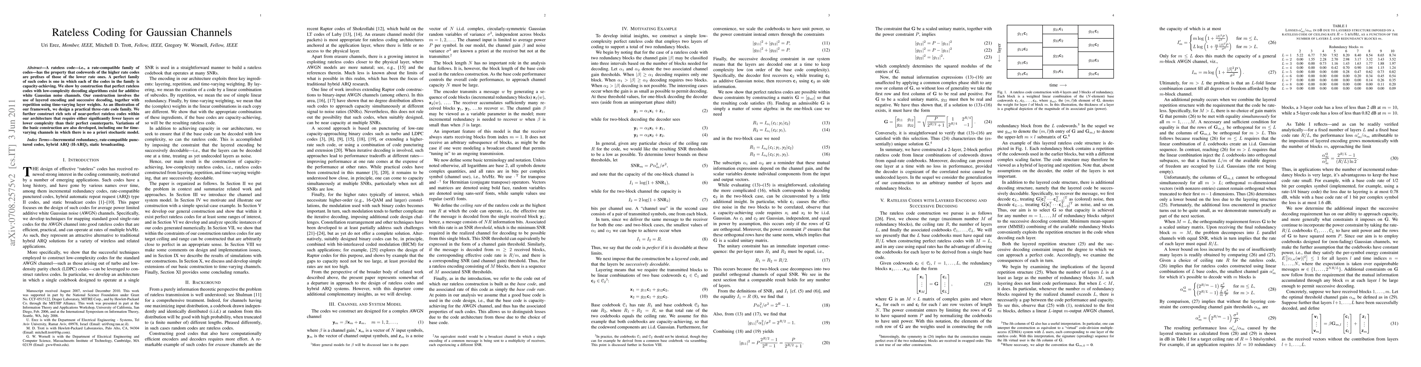 The paper constructs perfect rateless codes for additive white Gaussian noise channels using layered encoding and successive decoding, achieving capacity while maintaining low-complexity decoding. It also develops near-perfect codes requiring fewer layers or lower complexity, and extends the framework to time-varying channels without a priori models.