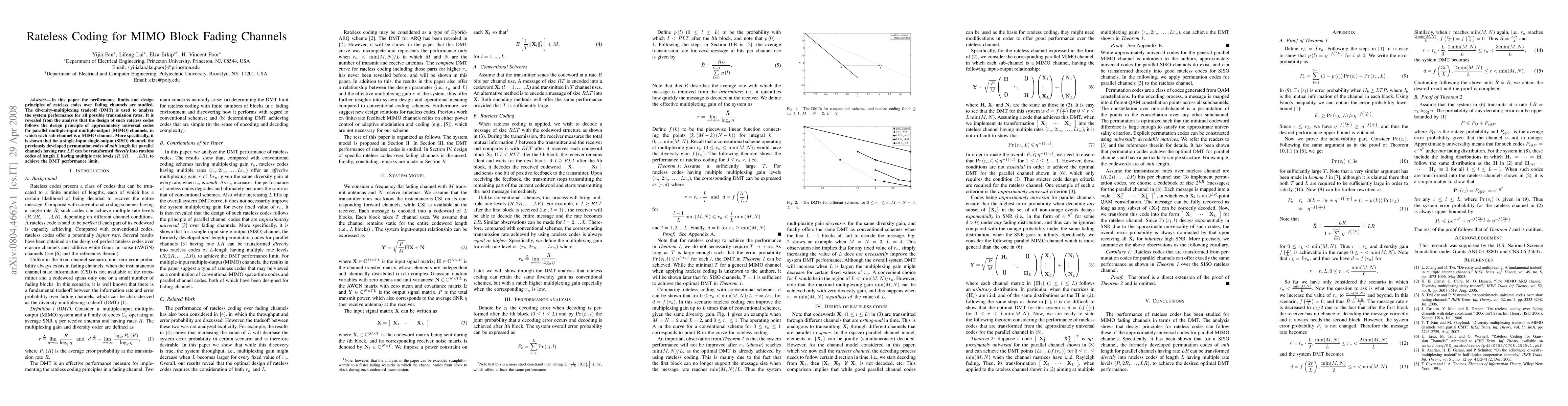 In this paper the performance limits and design principles of rateless codes over fading channels are studied. The diversity-multiplexing tradeoff (DMT) is used to analyze the system performance for all possible transmission rates. It is revealed from the analysis that the design of such rateless codes follows the design principle of approximately universal codes for parallel multiple-input multiple-output (MIMO) channels, in which each sub-channel is a MIMO channel. More specifically, it is shown that for a single-input single-output (SISO) channel, the previously developed permutation codes of unit length for parallel channels having rate LR can be transformed directly into rateless codes of length L having multiple rate levels (R, 2R, . . ., LR), to achieve the DMT performance limit.