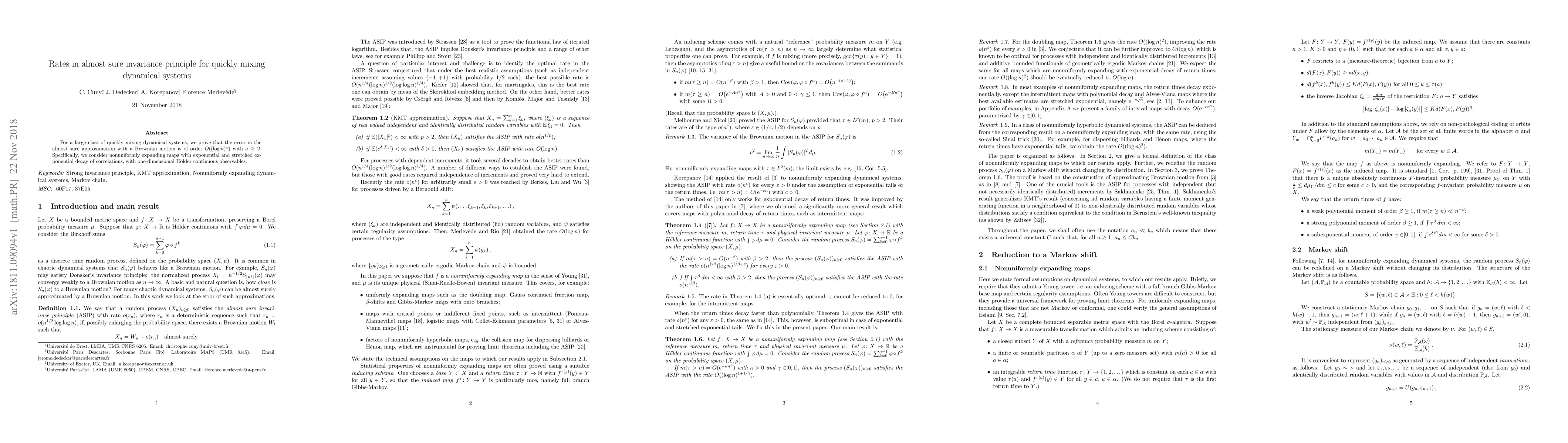 Summary: This paper proves that for quickly mixing dynamical systems, the error in approximating them with a Brownian motion is of order O((log n)^a) with a ≥ 2, focusing on nonuniformly expanding maps with exponential or stretched exponential decay of correlations and one-dimensional Hölder continuous observables.