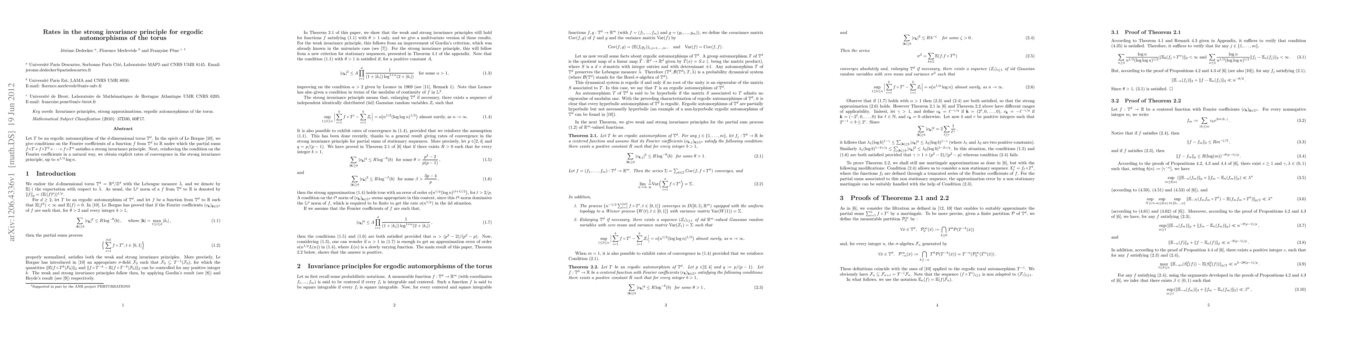 Let T be an ergodic automorphism of the d-dimensional torus. In the spirit of Le Borgne, we give conditions on the Fourier coeffi cients of a real valued function f under which the Birkhoff sums satis fy a strong invariance principle. Next, reinforcing the condition on the Fourier coeffi cients in a natural way, we obtain explicit rates of convergence in the strong invariance principle.