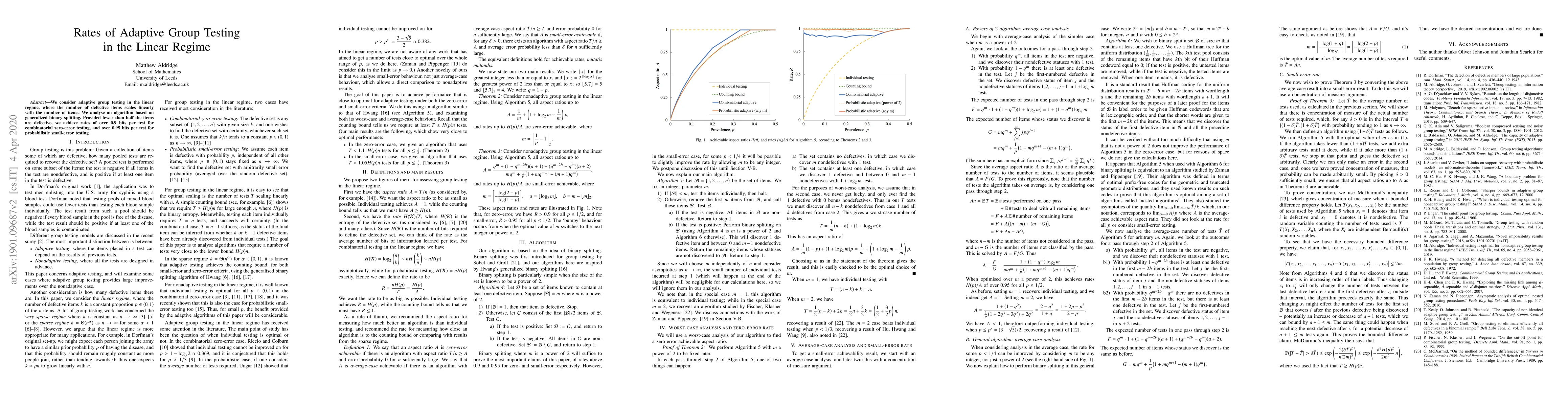 This paper investigates adaptive group testing in the linear regime, employing an algorithm based on generalized binary splitting. The study achieves over 0.9 bits per test for zero-error combinatorial testing and over 0.95 bits per test for probabilistic small-error testing when fewer than half the items are defective.
