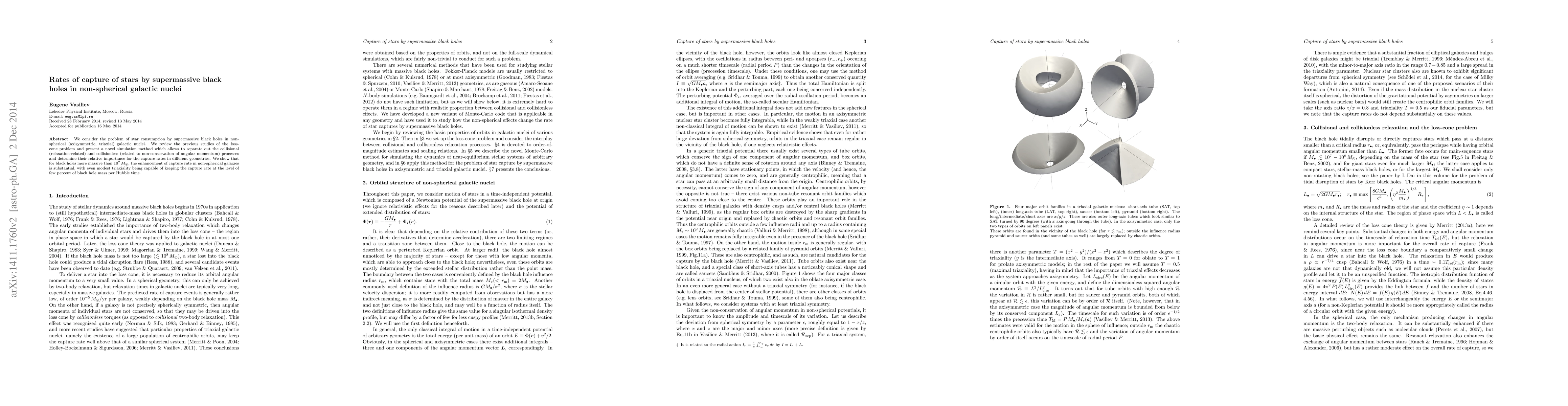 We consider the problem of star consumption by supermassive black holes in non-spherical (axisymmetric, triaxial) galactic nuclei. We review the previous studies of the loss-cone problem and present a novel simulation method which allows to separate out the collisional (relaxation-related) and collisionless (related to non-conservation of angular momentum) processes and determine their relative importance for the capture rates in different geometries. We show that for black holes more massive than 10^7 Msun, the enhancement of capture rate in non-spherical galaxies is substantial, with even modest triaxiality being capable of keeping the capture rate at the level of few percent of black hole mass per Hubble time.