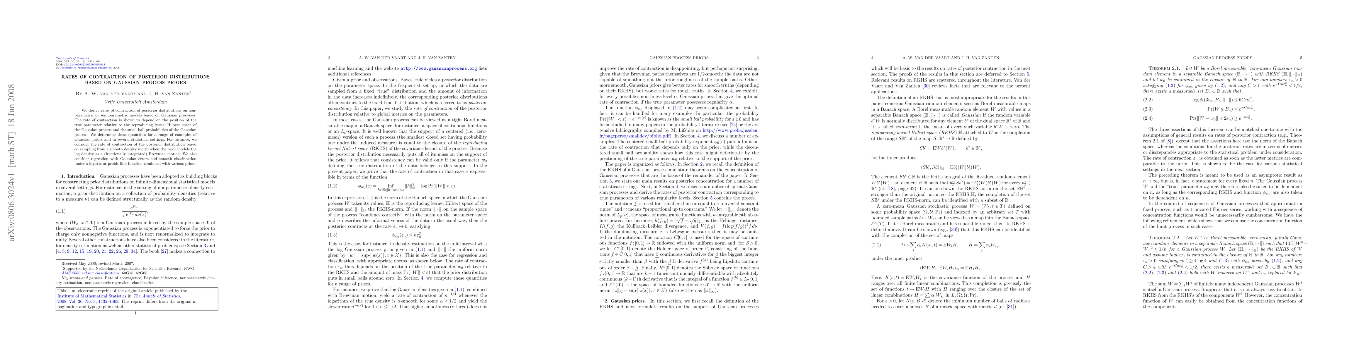 This paper derives contraction rates for posterior distributions in nonparametric and semiparametric models using Gaussian process priors, showing that these rates depend on the true parameter's position relative to the Gaussian process's Hilbert space and the Gaussian process's small ball probabilities. Various examples and statistical settings are examined, including smooth density models and regression with Gaussian errors.