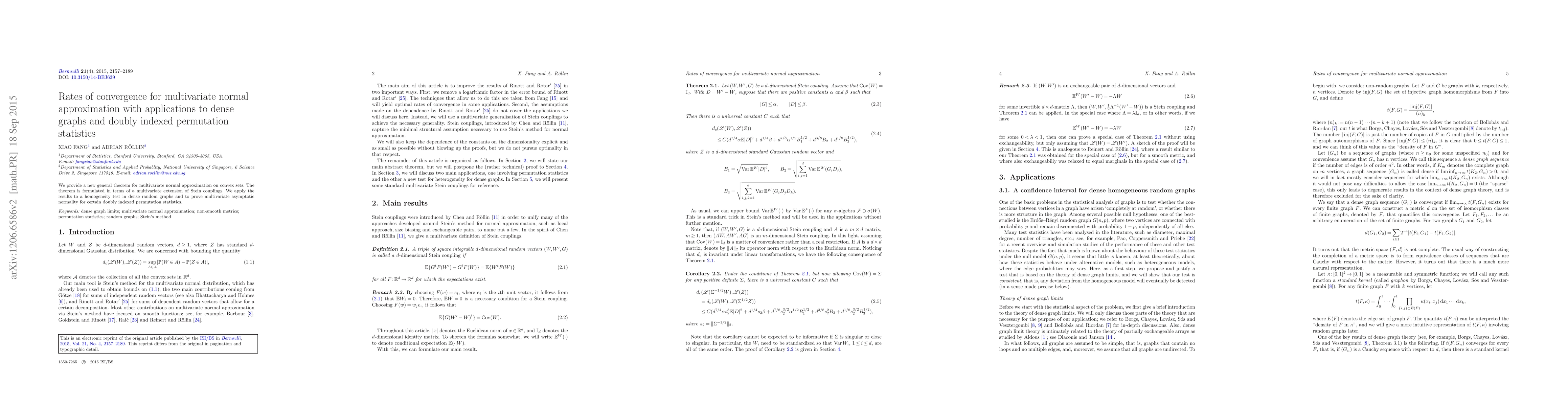 Summary: This paper presents a new multivariate normal approximation theorem using Stein couplings for convex sets, applying it to homogeneity tests in dense random graphs and establishing asymptotic normality for doubly indexed permutation statistics.