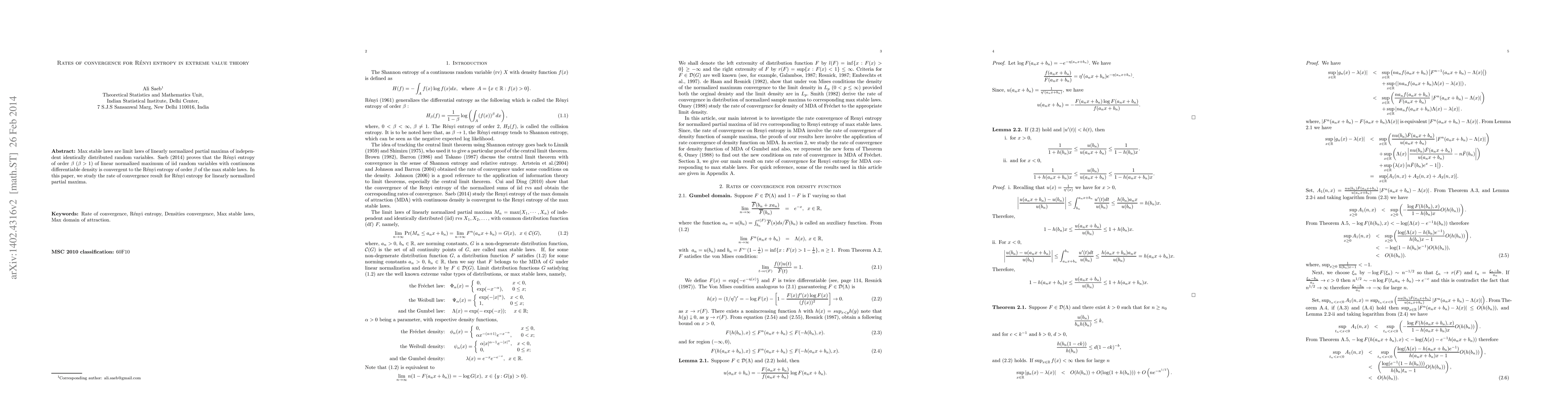 This paper investigates the speed at which the Renyi entropy of order b for linearly normalized partial maxima of independent, identically distributed random variables converges to the Renyi entropy of the corresponding max stable laws, building on Saeb's (2014) foundational proof of convergence.