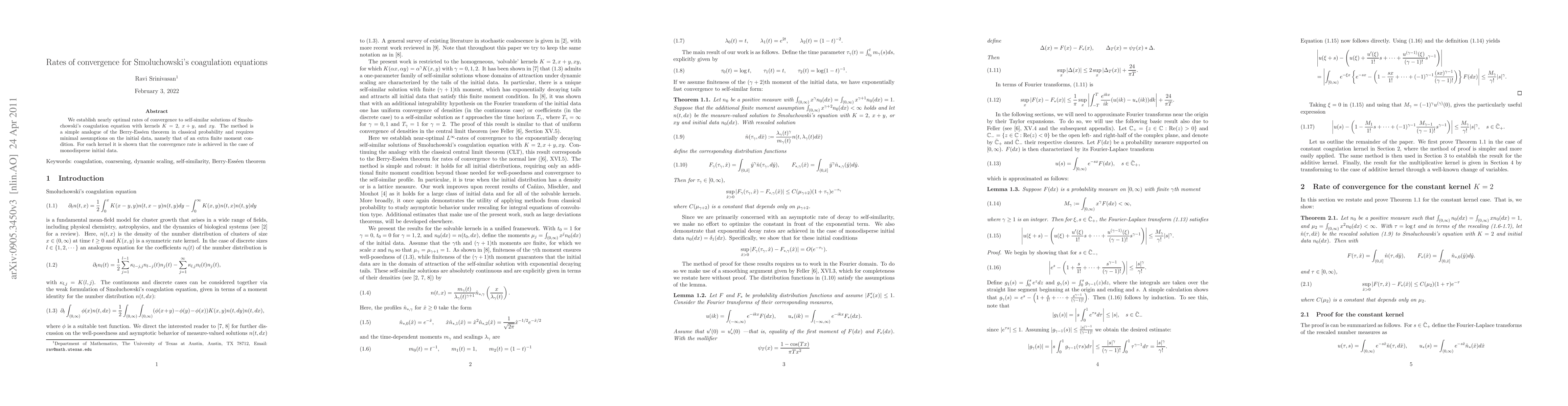 This paper establishes nearly optimal rates of convergence for Smoluchowski's coagulation equation with kernels x + y and xy, requiring minimal assumptions on initial data.