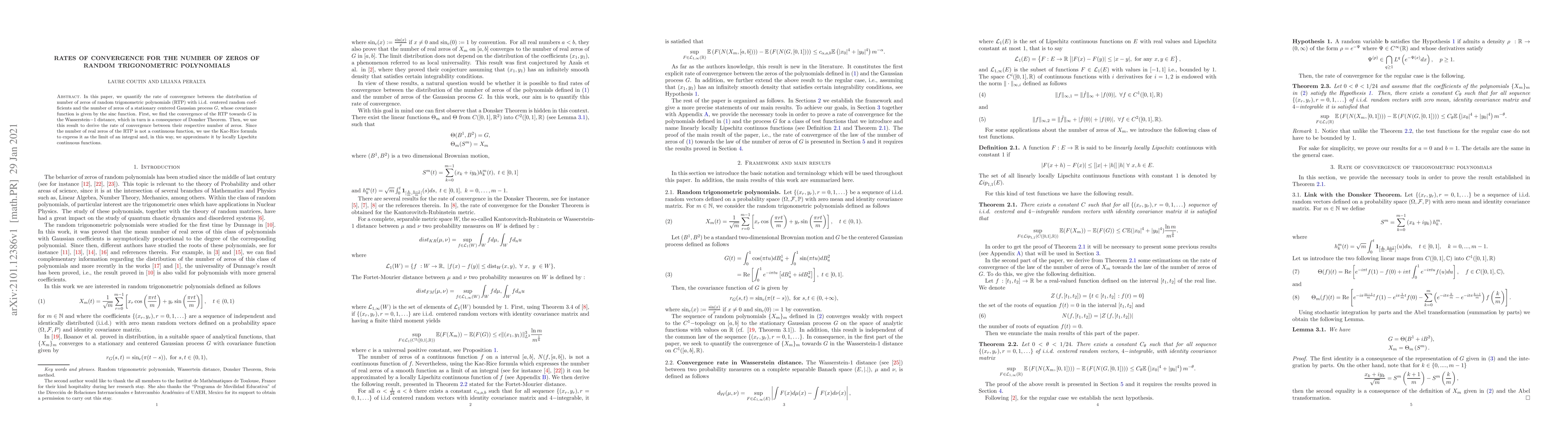 This paper investigates the rate of convergence between the zeros of random trigonometric polynomials (RTP) and a stationary Gaussian process G, showing convergence in Wasserstein-1 distance via Donsker's Theorem. It then derives the rate of convergence for their respective zero counts, approximating the non-continuous zero count of RTP using the Kac-Rice formula.