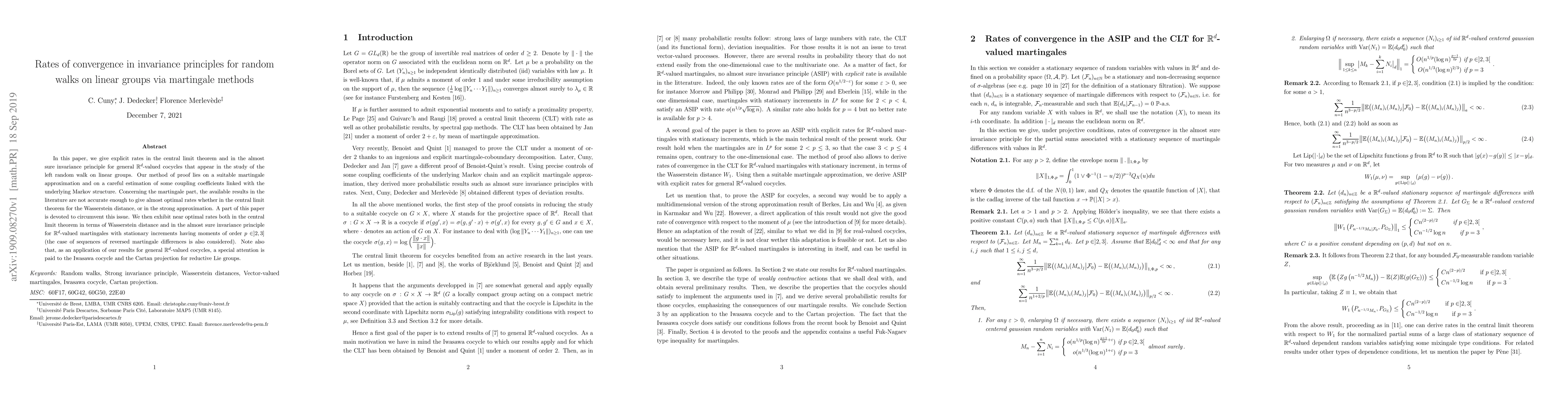 In this paper, we give explicit rates in the central limit theorem and in the almost sure invariance principle for general R d-valued cocycles that appear in the study of the left random walk on linear groups. Our method of proof lies on a suitable martingale approximation and on a careful estimation of some coupling coefficients linked with the underlying Markov structure. Concerning the martingale part, the available results in the literature are not accurate enough to give almost optimal rates whether in the central limit theorem for the Wasserstein distance, or in the strong approximation. A part of this paper is devoted to circumvent this issue. We then exhibit near optimal rates both in the central limit theorem in terms of Wasserstein distance and in the almost sure invariance principle for R d-valued martingales with stationary increments having moments of order p $\in$]2, 3] (the case of sequences of reversed martingale differences is also considered). Note also that, as an application of our results for general R d-valued cocycles, a special attention is paid to the Iwasawa cocycle and the Cartan projection for reductive Lie groups.