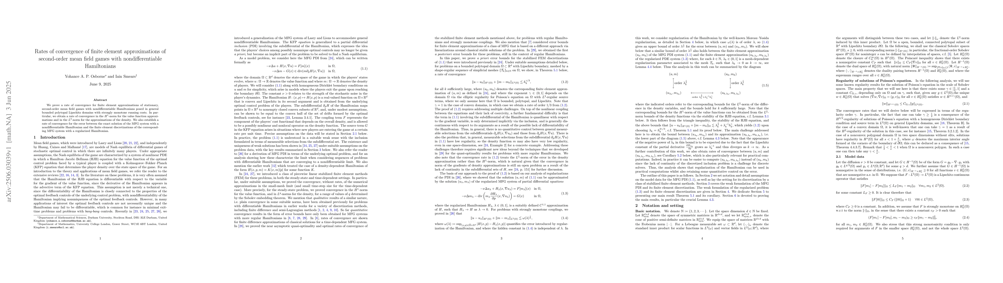 We prove a rate of convergence for finite element approximations of stationary, second-order mean field games with nondifferentiable Hamiltonians posed in general bounded polytopal Lipschitz domains with strongly monotone running costs. In particular, we obtain a rate of convergence in the $H^1$-norm for the value function approximations and in the $L^2$-norm for the approximations of the density. We also establish a rate of convergence for the error between the exact solution of the MFG system with a nondifferentiable Hamiltonian and the finite element discretizations of the corresponding MFG system with a regularized Hamiltonian.