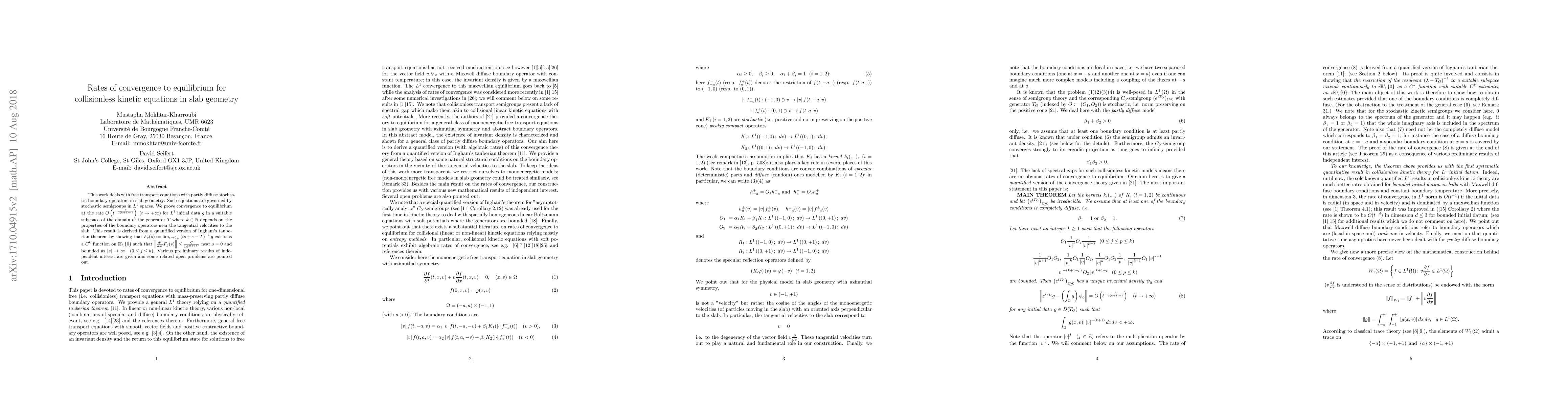 This paper investigates the rates of convergence to equilibrium for collisionless kinetic equations in slab geometry, proving a convergence rate of $O\left( t^{-\frac{k}{2(k+1)+1}}\right)$ for $L^{1}$ initial data, derived using a quantified version of Ingham's theorem. The result hinges on the existence of a $C^{k}$ function $F_{g}(s)$.
