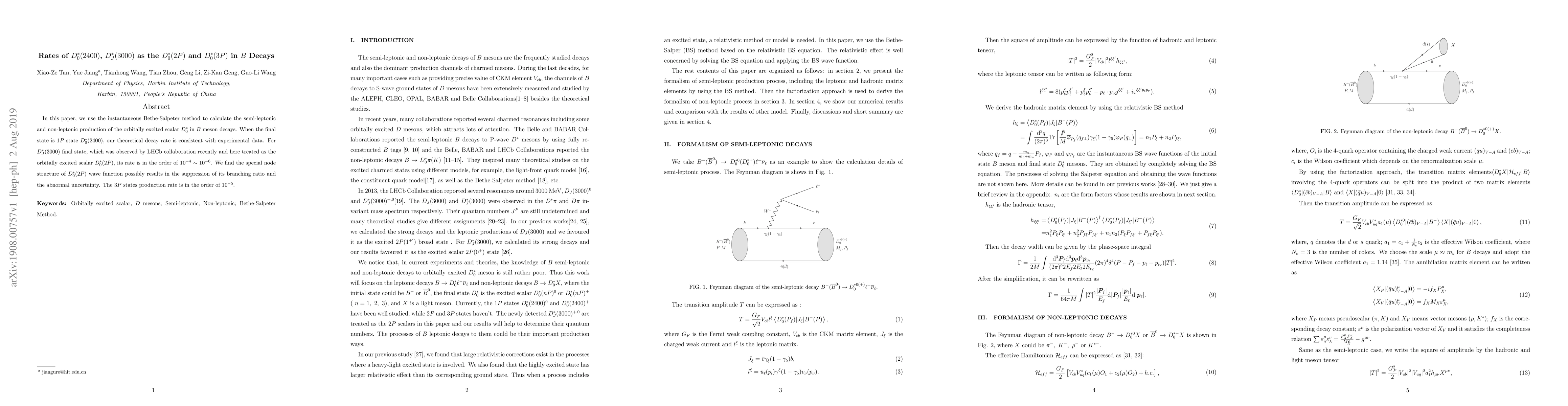 This study employs the instantaneous Bethe-Salpeter method to compute the production rates of orbitally excited D*0 states in B meson decays. The calculated rates for D0*(2400) align with experimental data, while the predicted rate for DJ*(3000), modeled as D0*(2P), ranges from 10^-4 to 10^-6. The paper also suggests that the unique node structure of D0*(2P) might explain its lower branching ratio uncertainty and lower production rate for 3P states, approximately 10^-5.