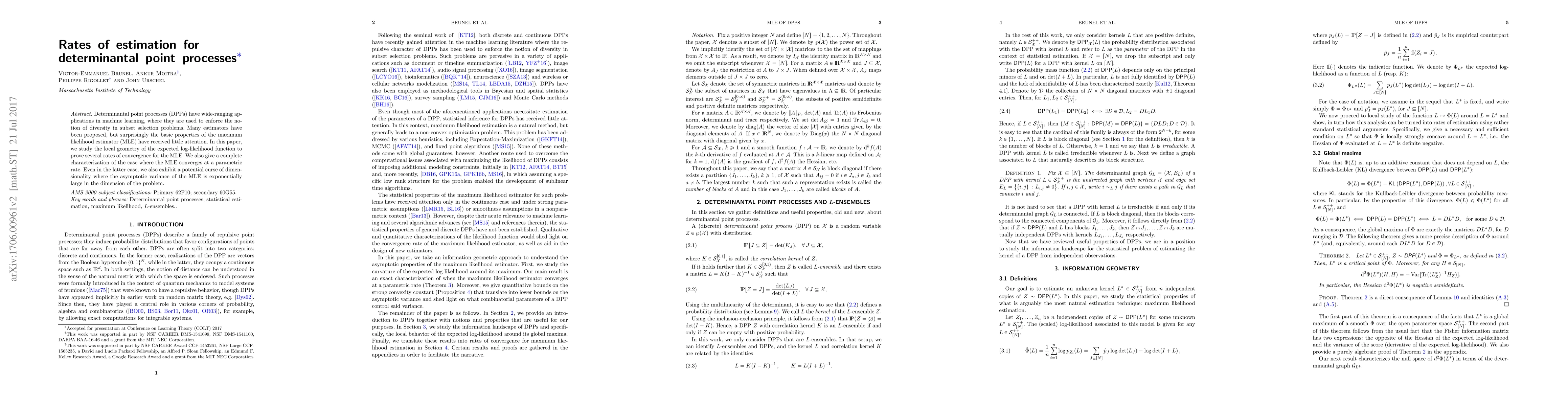 Determinantal point processes (DPPs) have wide-ranging applications in machine learning, where they are used to enforce the notion of diversity in subset selection problems. Many estimators have been proposed, but surprisingly the basic properties of the maximum likelihood estimator (MLE) have received little attention. In this paper, we study the local geometry of the expected log-likelihood function to prove several rates of convergence for the MLE. We also give a complete characterization of the case where the MLE converges at a parametric rate. Even in the latter case, we also exhibit a potential curse of dimensionality where the asymptotic variance of the MLE is exponentially large in the dimension of the problem.
