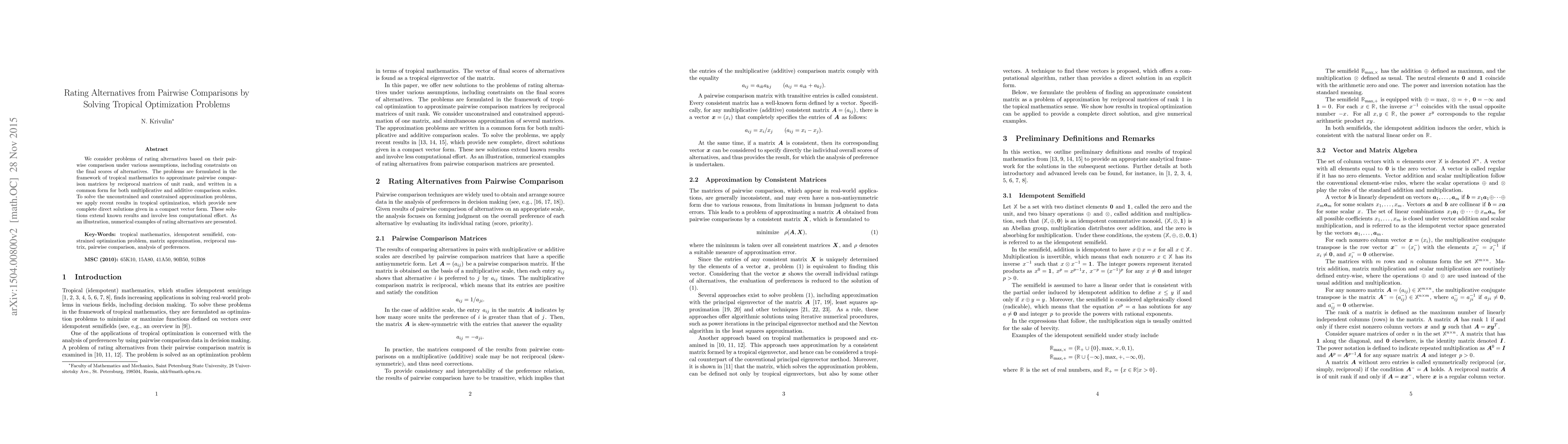 We consider problems of rating alternatives based on their pairwise comparison under various assumptions, including constraints on the final scores of alternatives. The problems are formulated in the framework of tropical mathematics to approximate pairwise comparison matrices by reciprocal matrices of unit rank, and written in a common form for both multiplicative and additive comparison scales. To solve the unconstrained and constrained approximation problems, we apply recent results in tropical optimization, which provide new complete direct solutions given in a compact vector form. These solutions extend known results and involve less computational effort. As an illustration, numerical examples of rating alternatives are presented.
