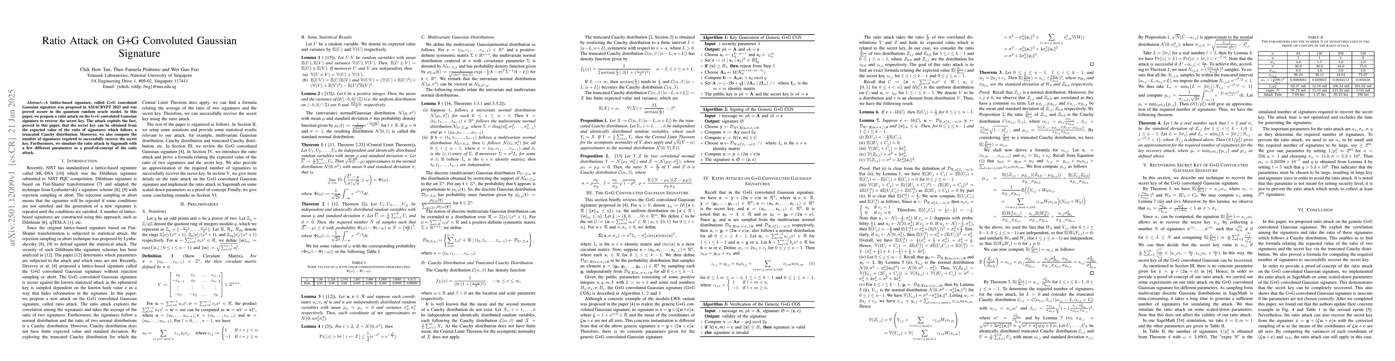 This paper proposes a ratio attack on the G+G convoluted Gaussian signature, demonstrating a method to recover the secret key by exploiting the expected value of the ratio of signatures that follows a truncated Cauchy distribution. It also calculates the number of signatures needed for successful key recovery and validates the attack via simulations in Sagemath.