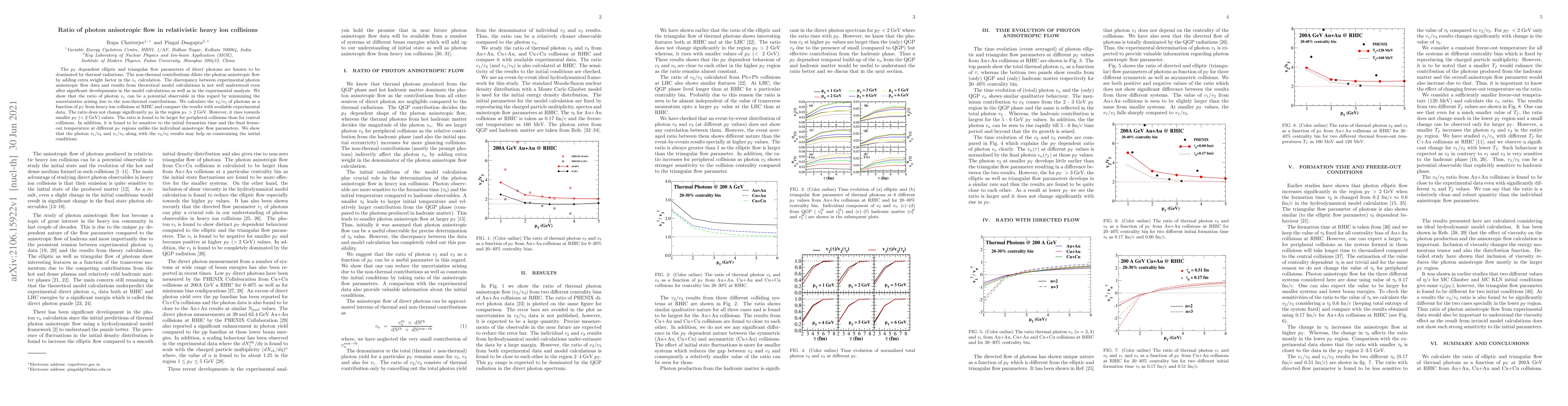 The $p_T$ dependent elliptic and triangular flow parameters of direct photons are known to be dominated by thermal radiations. The non-thermal contributions dilute the photon anisotropic flow by adding extra weight factor in the $v_n$ calculation. The discrepancy between experimental photon anisotropic flow data and results from theoretical model calculations is not well understood even after significant developments in the model calculations as well as in the experimental analysis. We show that the ratio of photon $v_n$ can be a potential observable in this regard by minimizing the uncertainties arising due to the non-thermal contributions. We calculate the $v_2/v_3$ of photons as a function of $p_T$ from heavy ion collisions at RHIC and compare the results with available experimental data. The ratio does not change significantly $p_T$ in the region $p_T>2$ GeV. However, it rises towards smaller $p_T$ ($< 2$ GeV) values. The ratio is found to be larger for peripheral collisions than for central collisions. In addition, it is found to be sensitive to the initial formation time and the final freeze-out temperature at different $p_T$ regions unlike the individual anisotropic flow parameters. We show that the photon $v_1/v_2$ and $v_1/v_3$ along with the $v_2/v_3$ results may help us constraining the initial conditions.