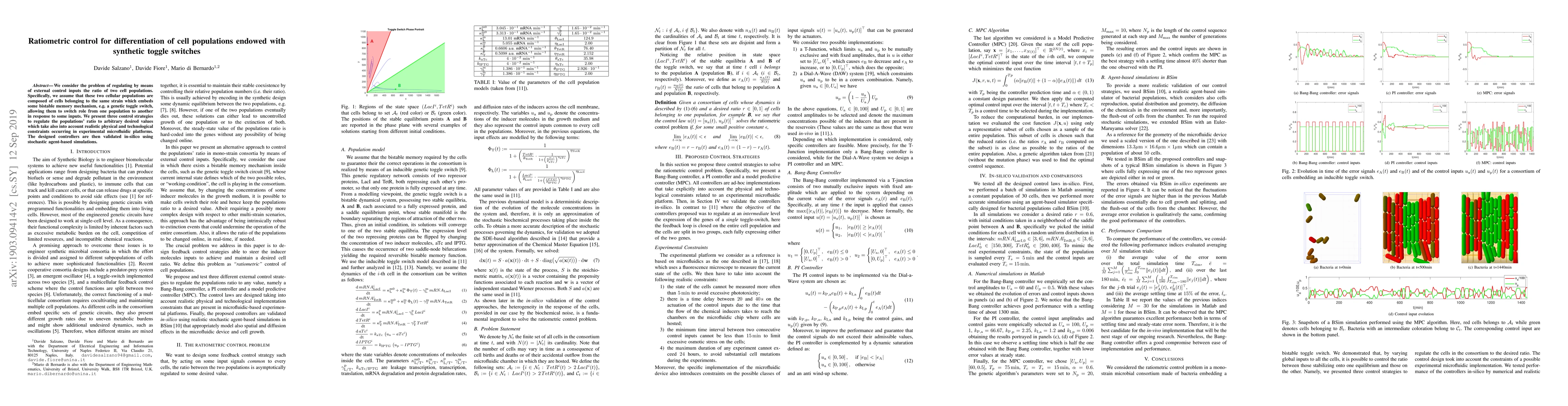 We consider the problem of regulating by means of external control inputs the ratio of two cell populations. Specifically, we assume that these two cellular populations are composed of cells belonging to the same strain which embeds some bistable memory mechanism, e.g. a genetic toggle switch, allowing them to switch role from one population to another in response to some inputs. We present three control strategies to regulate the populations' ratio to arbitrary desired values which take also into account realistic physical and technological constraints occurring in experimental microfluidic platforms. The designed controllers are then validated in-silico using stochastic agent-based simulations.