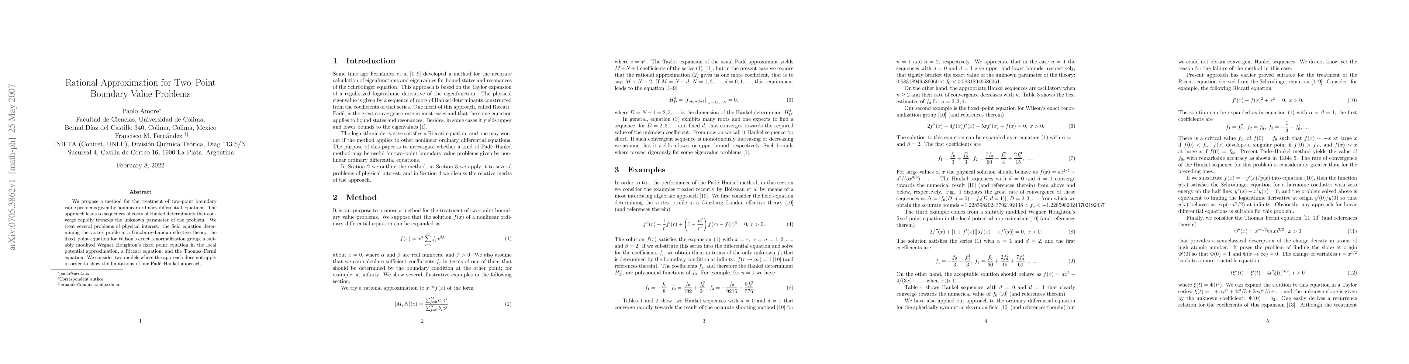 This paper proposes a rapid rational approximation method for solving nonlinear ordinary differential equations in two-point boundary value problems, employing sequences of roots of Hankel determinants. It successfully applies the method to various physical problems but also discusses cases where it fails, illustrating the limitations of the Padé-Hankel approach.