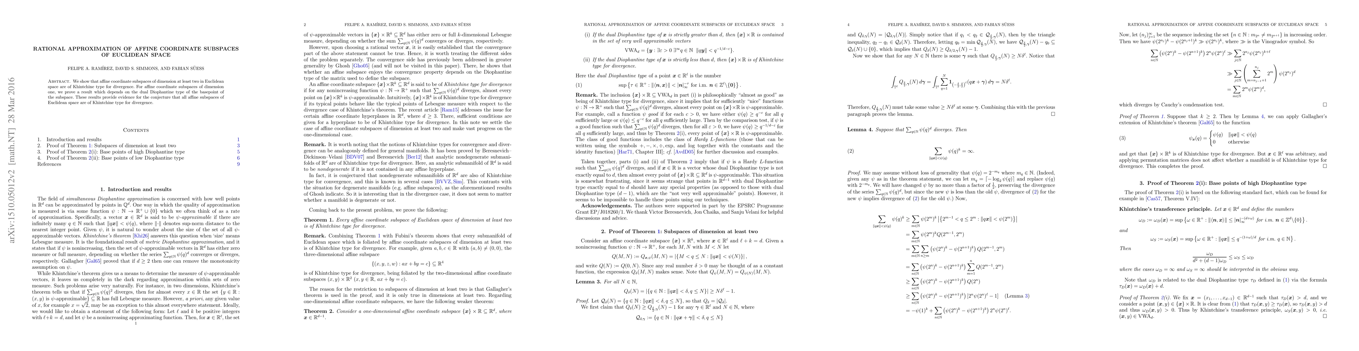 This paper shows that affine coordinate subspaces in Euclidean space have a specific type of measure, known as Khintchine type, which affects their divergence properties. The findings provide evidence for a conjecture that all affine subspaces in Euclidean space share this property.