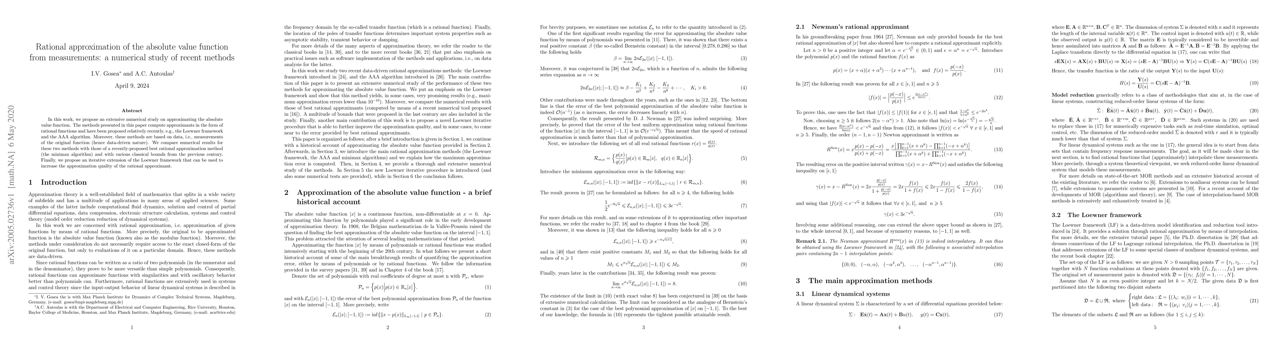 In this work, we propose an extensive numerical study on approximating the absolute value function. The methods presented in this paper compute approximants in the form of rational functions and have been proposed relatively recently, e.g., the Loewner framework and the AAA algorithm. Moreover, these methods are based on data, i.e., measurements of the original function (hence data-driven nature). We compare numerical results for these two methods with those of a recently-proposed best rational approximation method (the minimax algorithm) and with various classical bounds from the previous century. Finally, we propose an iterative extension of the Loewner framework that can be used to increase the approximation quality of the rational approximant.