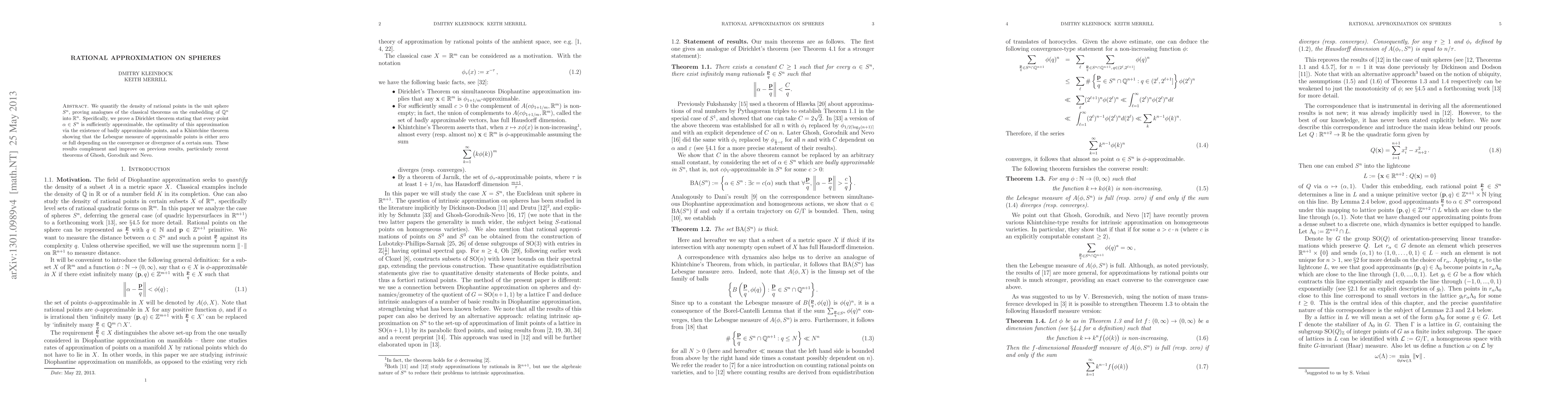 We quantify the density of rational points in the unit sphere $S^n$, proving analogues of the classical theorems on the embedding of $\q^n$ into $\r^n$. Specifically, we prove a Dirichlet theorem stating that every point $\alpha \in S^n$ is sufficiently approximable, the optimality of this approximation via the existence of badly approximable points, and a Khintchine theorem showing that the Lebesgue measure of approximable points is either zero or full depending on the convergence or divergence of a certain sum. These results complement and improve on previous results, particularly recent theorems of Ghosh, Gorodnik and Nevo.