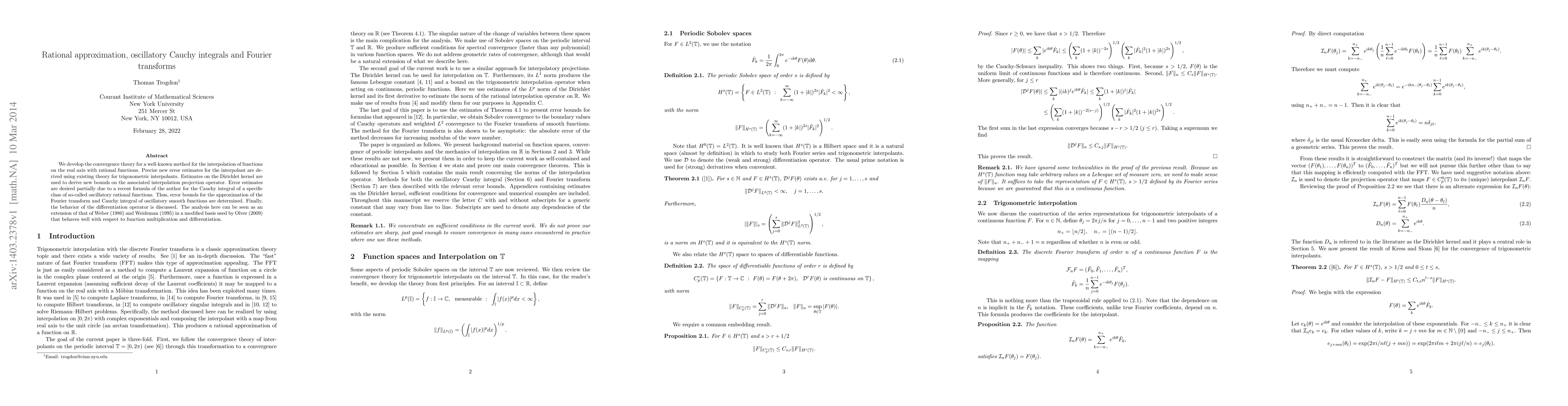 This paper develops a convergence theory for rational function interpolation, deriving new error estimates using trigonometric interpolant theory and bounds on the Dirichlet kernel. It extends previous work by providing error bounds for Fourier transforms and Cauchy integrals of oscillatory smooth functions, and discusses the behavior of the differentiation operator.