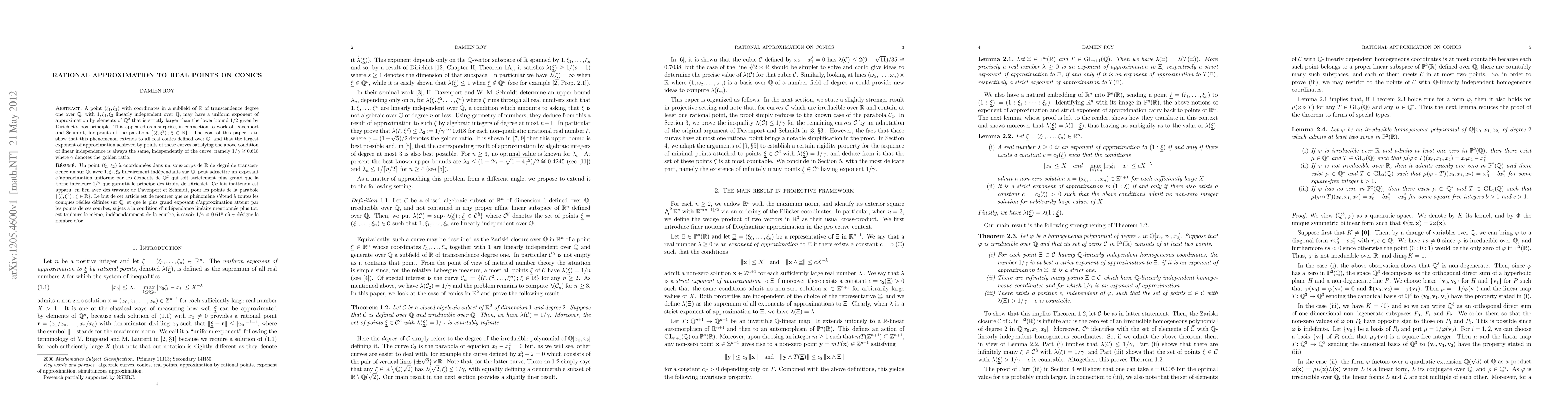 Research shows that real points on conics can approximate elements of Q^2 with an exponent strictly larger than Dirichlet's lower bound of 1/2, with the maximum achievable exponent being approximately 0.618 for points satisfying linear independence over Q.