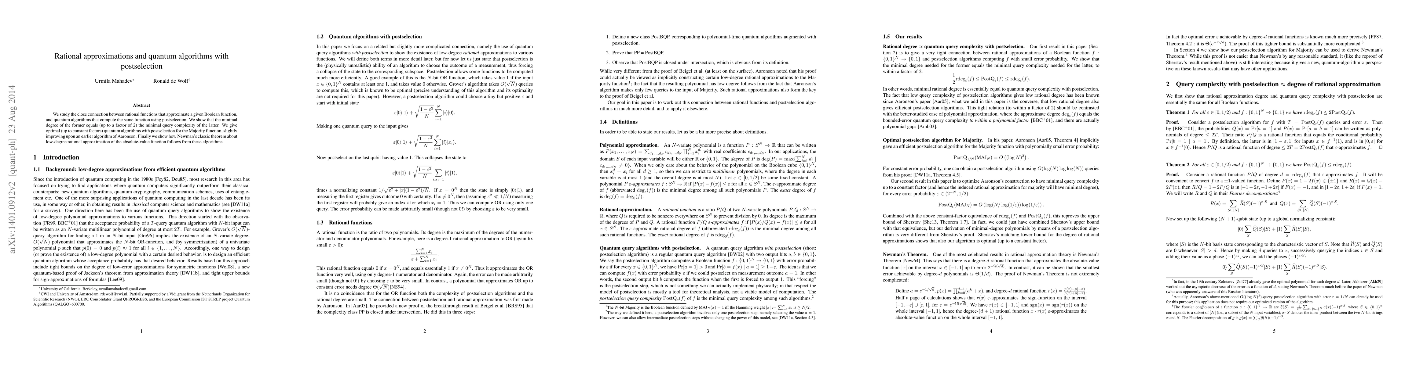 We study the close connection between rational functions that approximate a given Boolean function, and quantum algorithms that compute the same function using postselection. We show that the minimal degree of the former equals (up to a factor of 2) the minimal query complexity of the latter. We give optimal (up to constant factors) quantum algorithms with postselection for the Majority function, slightly improving upon an earlier algorithm of Aaronson. Finally we show how Newman's classic theorem about low-degree rational approximation of the absolute-value function follows from these algorithms.