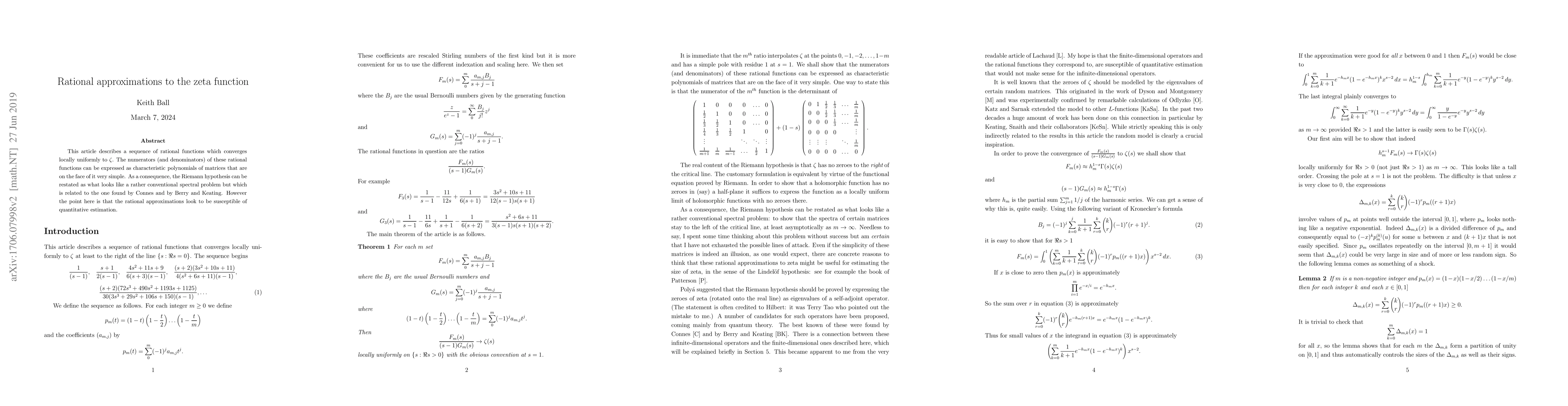 This paper introduces a sequence of rational functions converging to the zeta function, with polynomials derived from simple matrix characteristic polynomials, offering a new perspective on the Riemann hypothesis as a spectral problem. The approximations are quantitatively estimable.