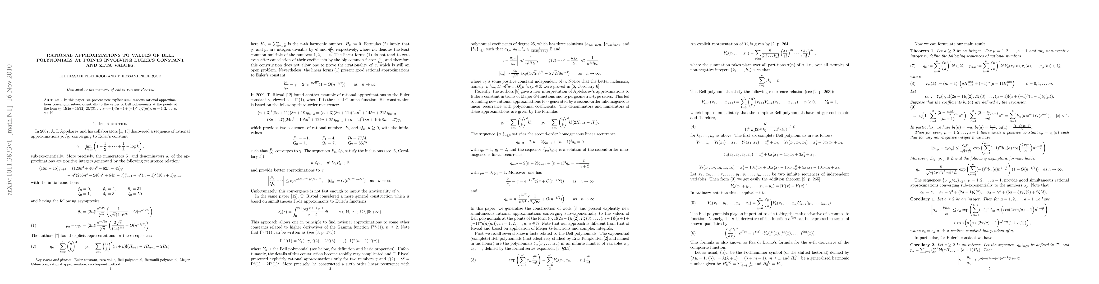 This paper introduces new rational approximations that converge sub-exponentially to Bell polynomials evaluated at points involving Euler's constant and zeta values. These approximations provide accurate and simultaneous results for specified sequences of such evaluations.
