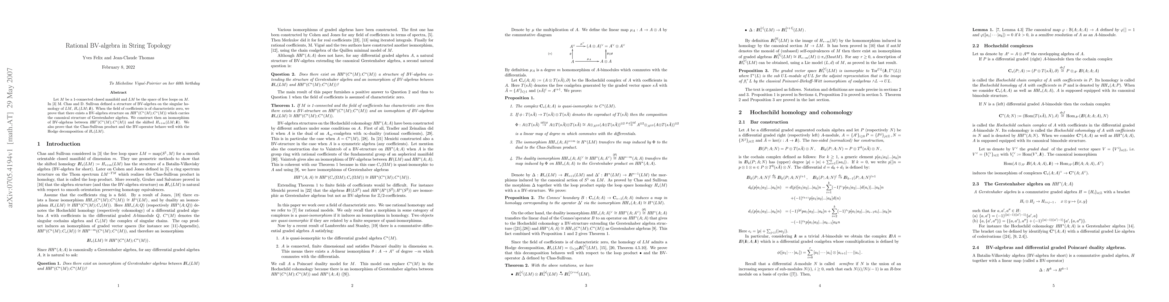 Let $M$ be a 1-connected closed manifold and $LM$ be the space of free loops on $M$. In \cite{C-S} M. Chas and D. Sullivan defined a structure of BV-algebra on the singular homology of $LM$, $H_\ast(LM; \bk)$. When the field of coefficients is of characteristic zero, we prove that there exists a BV-algebra structure on $\hH^\ast(C^\ast (M); C^\ast (M))$ which carries the canonical structure of Gerstenhaber algebra. We construct then an isomorphism of BV-algebras between $\hH^\ast (C^\ast (M); C^\ast (M)) $ and the shifted $ H_{\ast+m} (LM; {\bk})$. We also prove that the Chas-Sullivan product and the BV-operator behave well with the Hodge decomposition of $H_\ast (LM) $.