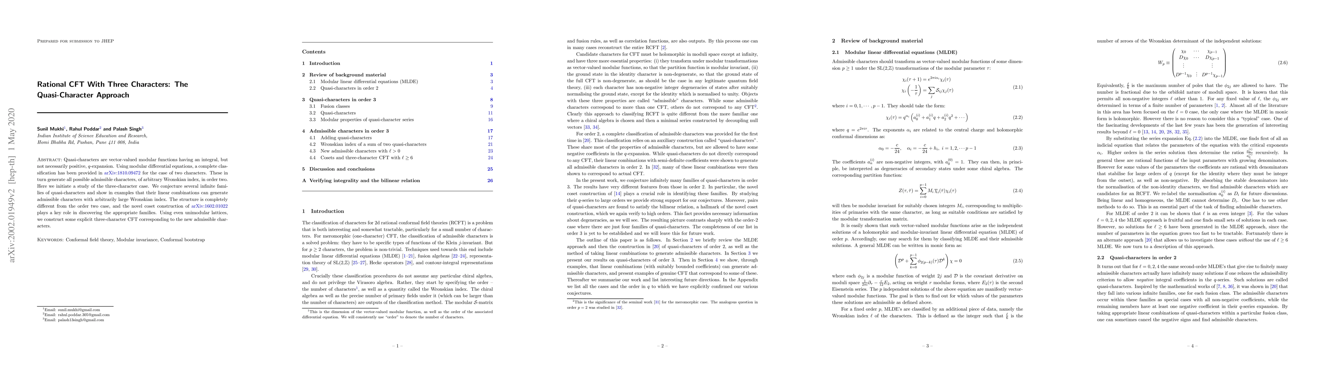 Quasi-characters are vector-valued modular functions having an integral, but not necessarily positive, q-expansion. Using modular differential equations, a complete classification has been provided in arXiv:1810.09472 for the case of two characters. These in turn generate all possible admissible characters, of arbitrary Wronskian index, in order two. Here we initiate a study of the three-character case. We conjecture several infinite families of quasi-characters and show in examples that their linear combinations an generate admissible characters with arbitrarily large Wronskian index. The structure is completely different from the order two case, and the novel coset construction of arXiv:1602.01022 plays a key role in discovering the appropriate families. Using even unimodular lattices, we construct some explicit three-character CFT corresponding to the new admissible characters.