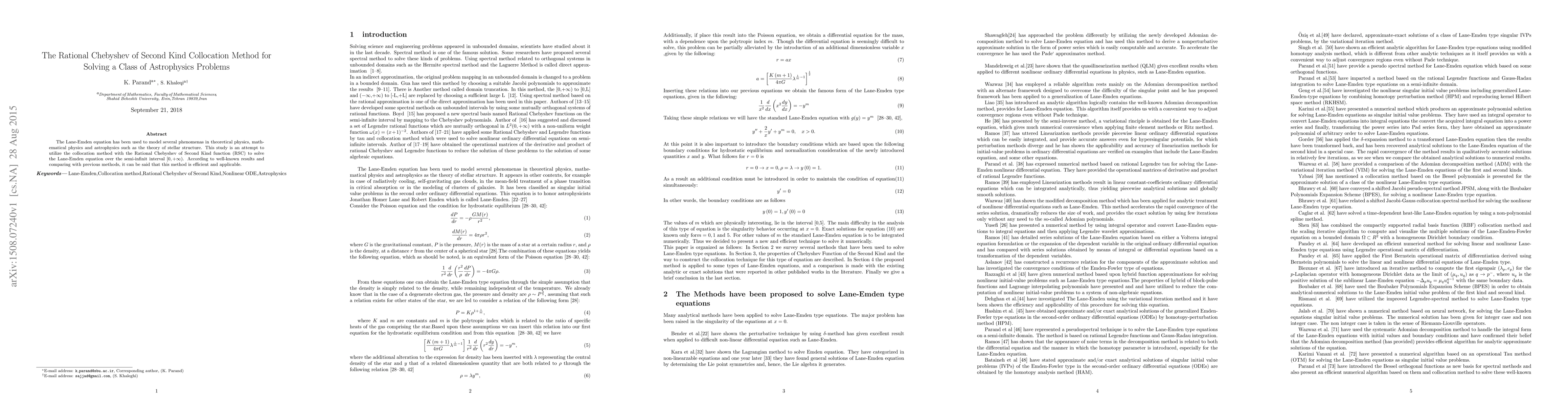 The Lane-Emden equation has been used to model several phenomenas in theoretical physics, mathematical physics and astrophysics such as the theory of stellar structure. This study is an attempt to utilize the collocation method with the Rational Chebyshev of Second Kind function (RSC) to solve the Lane-Emden equation over the semi-infinit interval [0; +infinity). According to well-known results and comparing with previous methods, it can be said that this method is efficient and applicable.