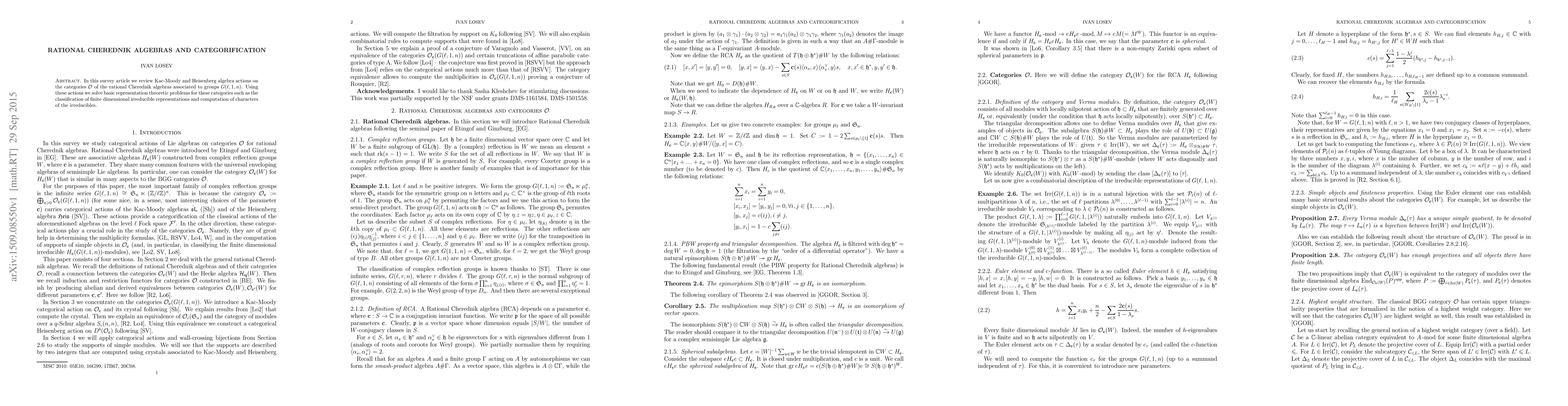 This paper surveys the representation theory of rational Cherednik algebras linked to Kac-Moody and Heisenberg algebras, solving key problems like classifying finite-dimensional irreducible representations and computing their characters.