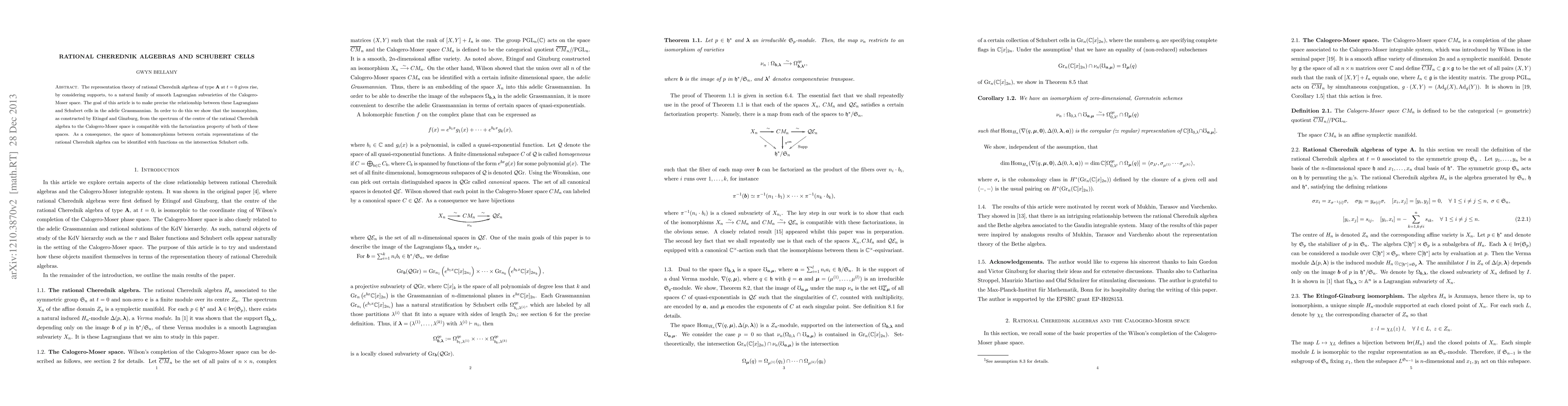 This paper explores the relationship between Lagrangian subvarieties in the Calogero-Moser space and Schubert cells in the adelic Grassmannian, arising from the representation theory of rational Cherednik algebras at t=0. It demonstrates compatibility between the isomorphism from the centre of the algebra to the Calogero-Moser space and the factorization property, leading to an identification of homomorphisms between representations with functions on intersection Schubert cells.