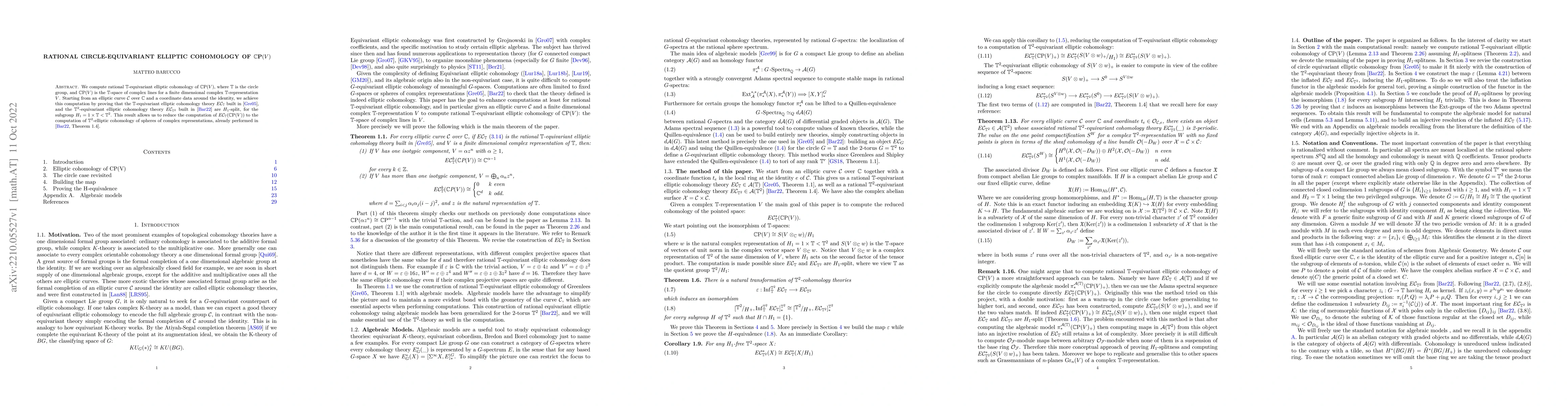 We compute rational $T$-equivariant elliptic cohomology of CP(V), where $T$ is the circle group, and CP(V) is the $T$-space of complex lines for a finite dimensional complex $T$-representation V. Starting from an elliptic curve C over the complex numbers and a coordinate data around the identity, we achieve this computation by proving that the $T$-equivariant elliptic cohomology theory $EC_T$ built in [Gre05], and the $T^2$-equivariant elliptic cohomology theory $EC_{T^2}$ built in [Bar22] are 1x$T$-split. This result allows us to reduce the computation of $EC_T(CP(V))$ to the computation of $T^2$-elliptic cohomology of spheres of complex representations, already performed in [Bar22].