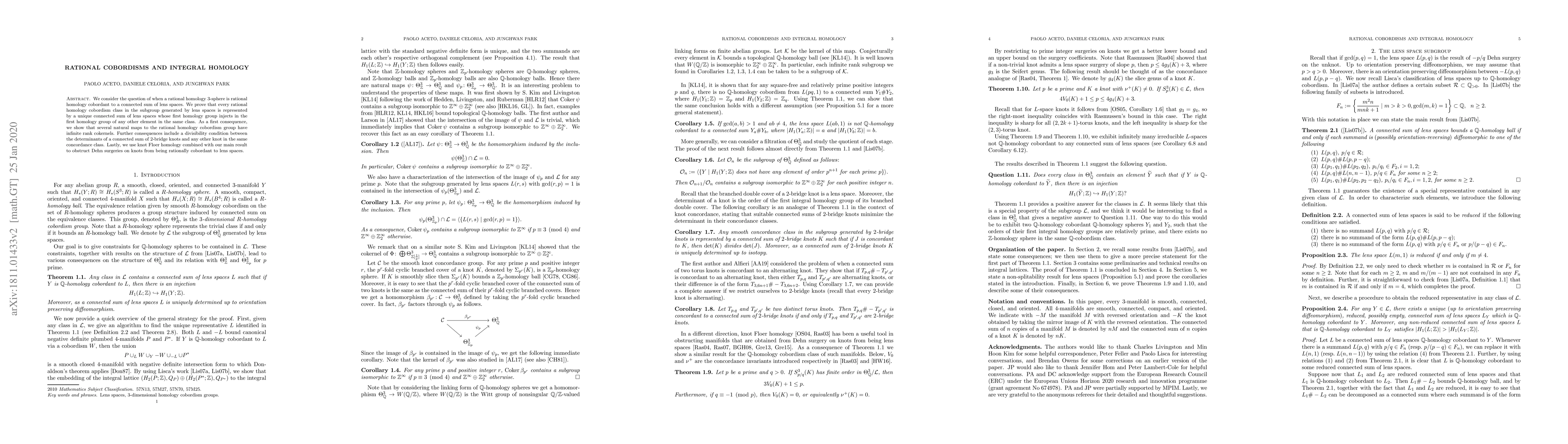 We consider the question of when a rational homology 3-sphere is rational homology cobordant to a connected sum of lens spaces. We prove that every rational homology cobordism class in the subgroup generated by lens spaces is represented by a unique connected sum of lens spaces whose first homology embeds in any other element in the same class. As a first consequence, we show that several natural maps to the rational homology cobordism group have infinite rank cokernels. Further consequences include a divisibility condition between the determinants of a connected sum of 2-bridge knots and any other knot in the same concordance class. Lastly, we use knot Floer homology combined with our main result to obstruct Dehn surgeries on knots from being rationally cobordant to lens spaces.