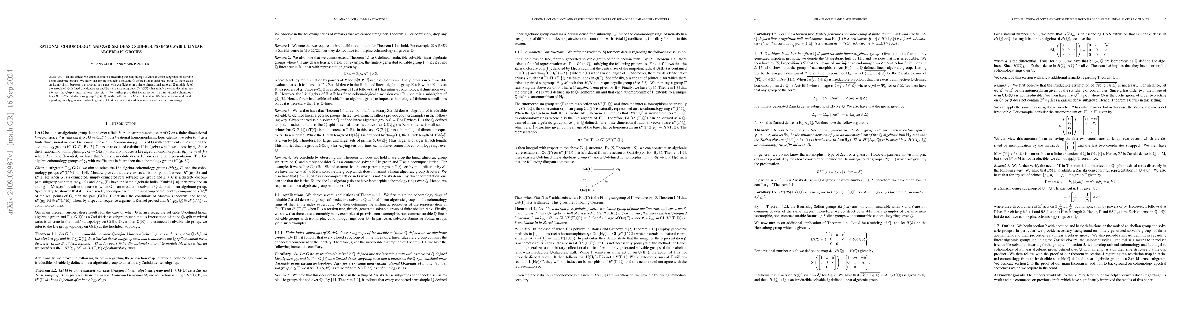 This paper establishes an isomorphism between the cohomology rings of irreducible solvable $\mathbb{Q}$-defined linear algebraic groups and their Zariski dense subgroups, showing that the restriction map in rational cohomology is injective. It also derives results about finitely generated solvable groups of finite abelian rank and their representations on cohomology.