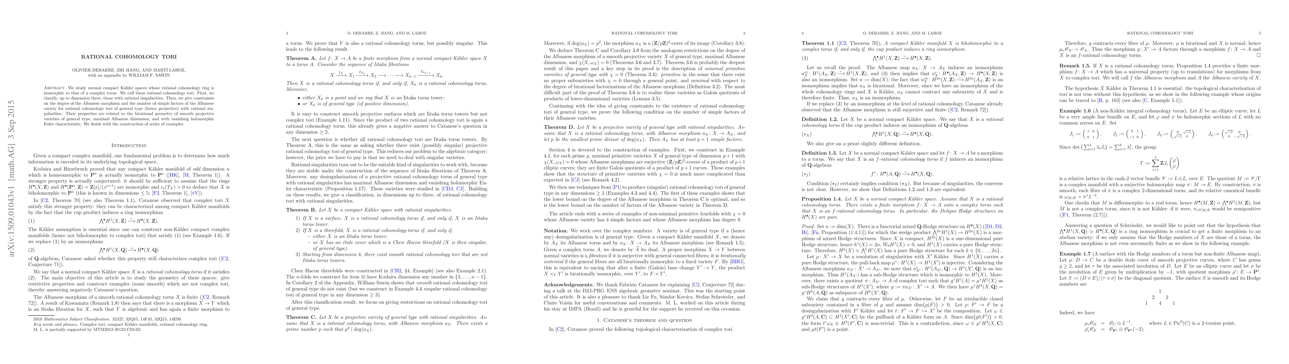 We study normal compact K\"ahler spaces whose rational cohomology ring is isomorphic to that of a complex torus. We call them rational cohomology tori. We classify, up to dimension three, those with rational singularities. We then give constraints on the degree of the Albanese morphism and the number of simple factors of the Albanese variety for rational cohomology tori of general type (hence projective) with rational singularities. Their properties are related to the birational geometry of smooth projective varieties of general type, maximal Albanese dimension, and with vanishing holomorphic Euler characteristic. We finish with the construction of series of examples.