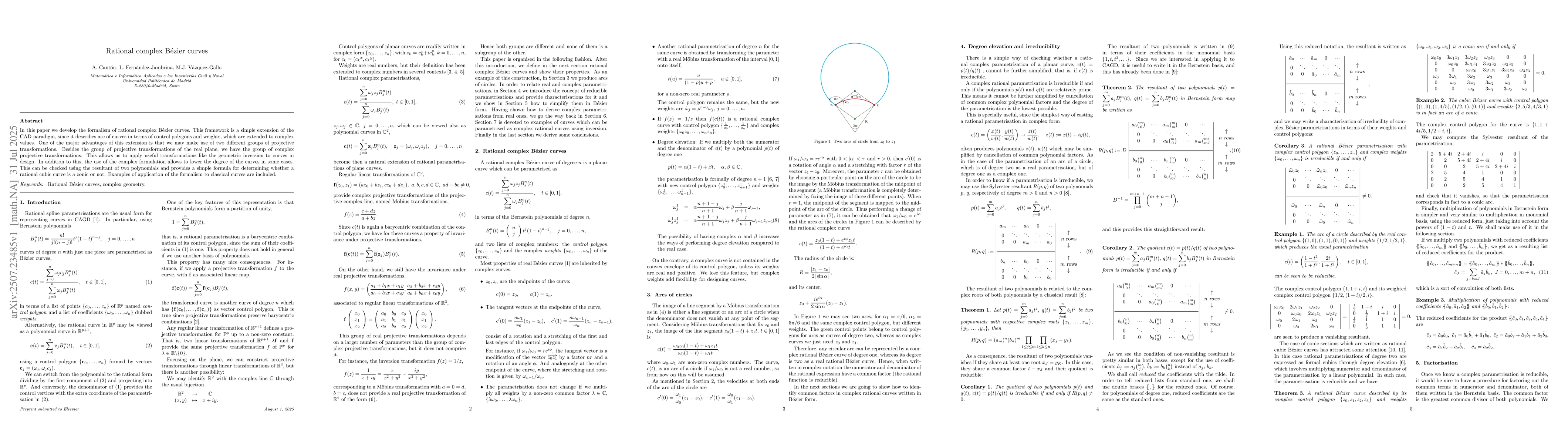 In this paper we develop the formalism of rational complex Bezier curves. This framework is a simple extension of the CAD paradigm, since it describes arc of curves in terms of control polygons and weights, which are extended to complex values. One of the major advantages of this extension is that we may make use of two different groups of projective transformations. Besides the group of projective transformations of the real plane, we have the group of complex projective transformations. This allows us to apply useful transformations like the geometric inversion to curves in design. In addition to this, the use of the complex formulation allows to lower the degree of the curves in some cases. This can be checked using the resultant of two polynomials and provides a simple formula for determining whether a rational cubic curve is a conic or not. Examples of application of the formalism to classical curves are included.