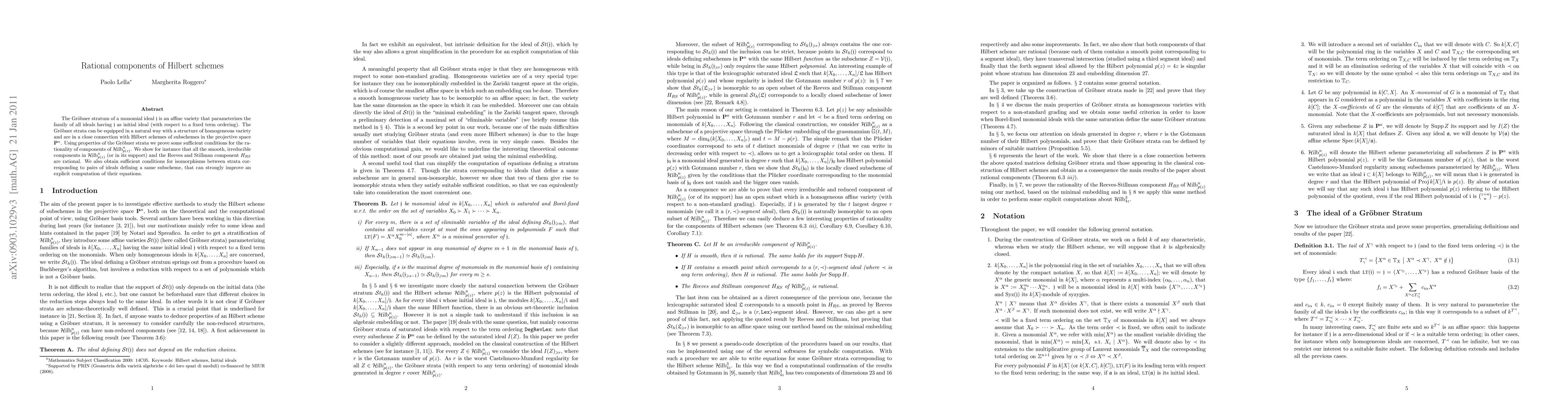 The Gr\"obner stratum of a monomial ideal $\id{j}$ is an affine variety that parametrizes the family of all ideals having $\id{j}$ as initial ideal (with respect to a fixed term ordering). The Gr\"obner strata can be equipped in a natural way of a structure of homogeneous variety and are in a close connection with Hilbert schemes of subvarieties in the projective space $\PP^n$. Using properties of the Gr\"obner strata we prove some sufficient conditions for the rationality of components of $\hilb_{p(z)}^n$. We show for instance that all the smooth, irreducible components in $\hilb_{p(z)}^n$ (or in its support) and the Reeves and Stillman component $H_{RS}$ are rational.