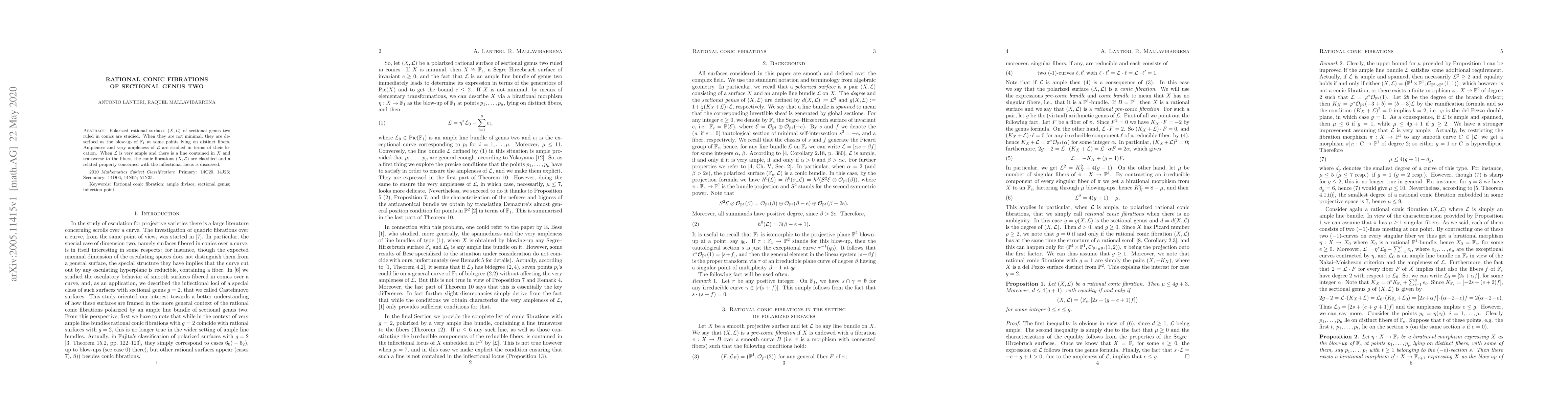 Researchers studied rational conic fibrations of surfaces with sectional genus two, classifying them when a line is transverse to the fibers and very ample. They also explored properties related to inflectional loci.